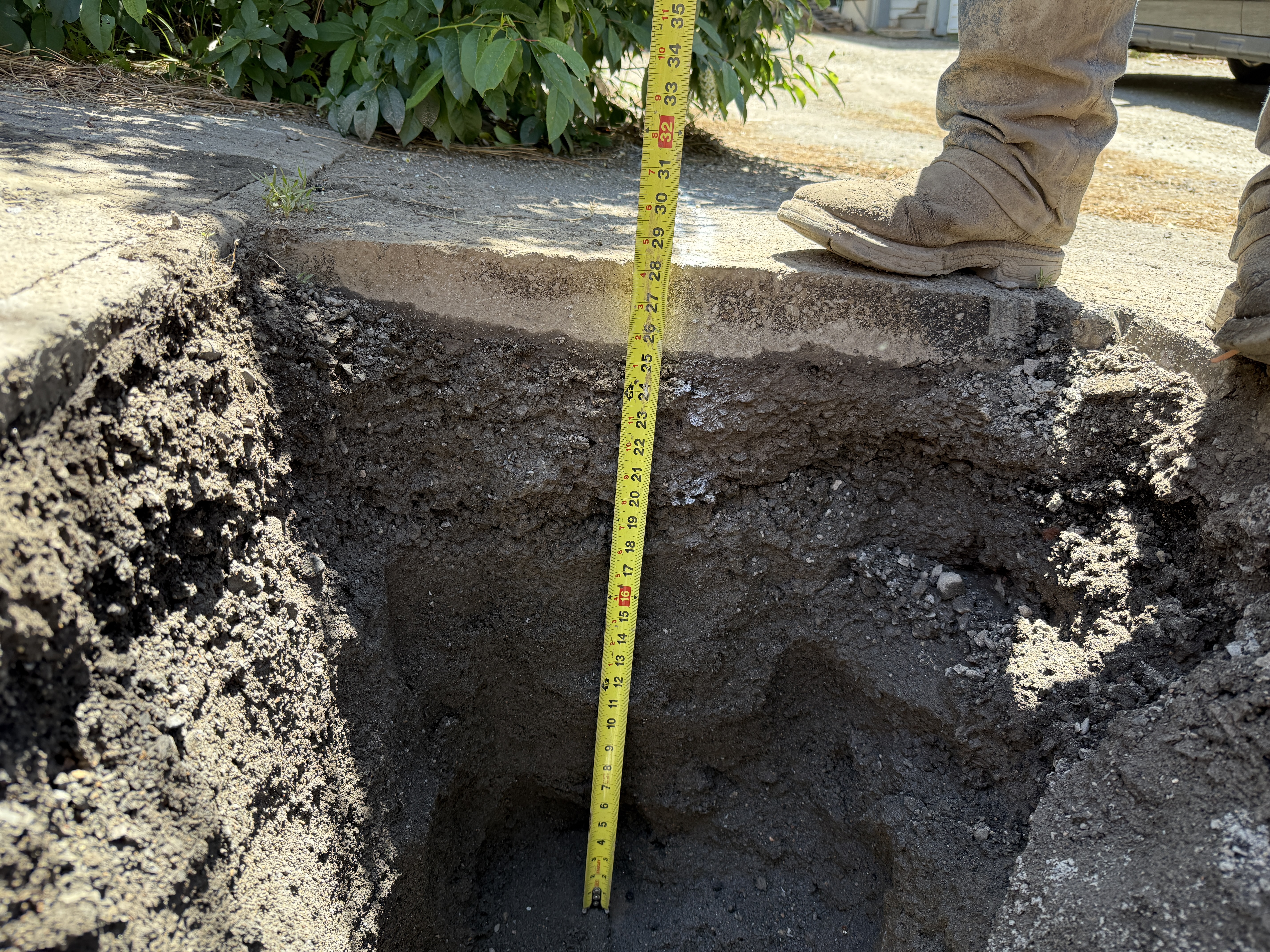 The image shows a pothole excavation with a measuring tape indicating the depth of the hole next to a concrete sidewalk. A person's feet are visible at the edge of the excavation, standing on the sidewalk. The soil layers are clearly visible, showing different strata. The potholing appears to be for utility locating purposes.