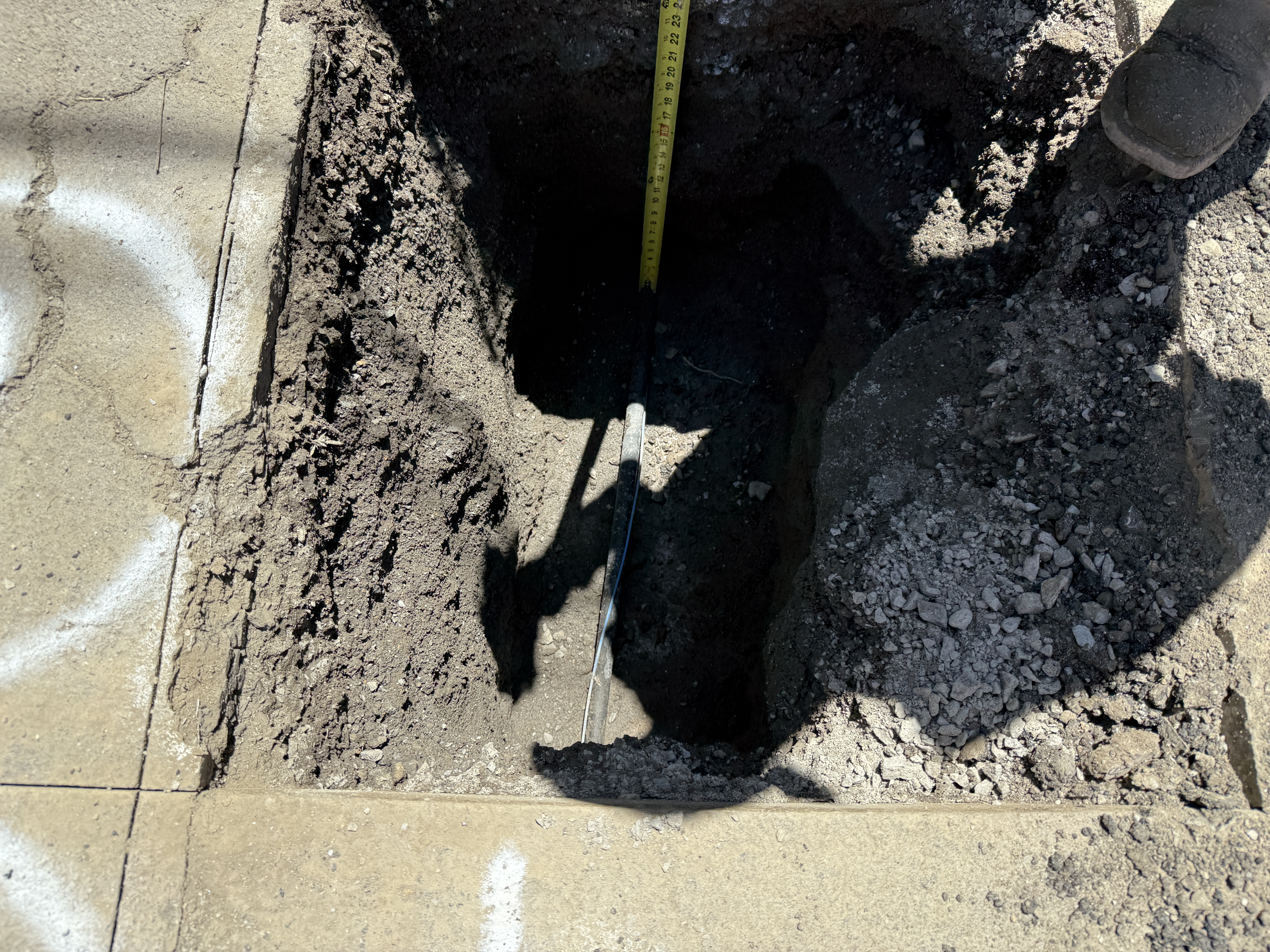 The image shows a pothole excavation in progress with soil piled on one side and a measuring tape indicating depth. The work area includes a concrete surface with markings near the edge of the hole. A boot is partially visible near the excavation.