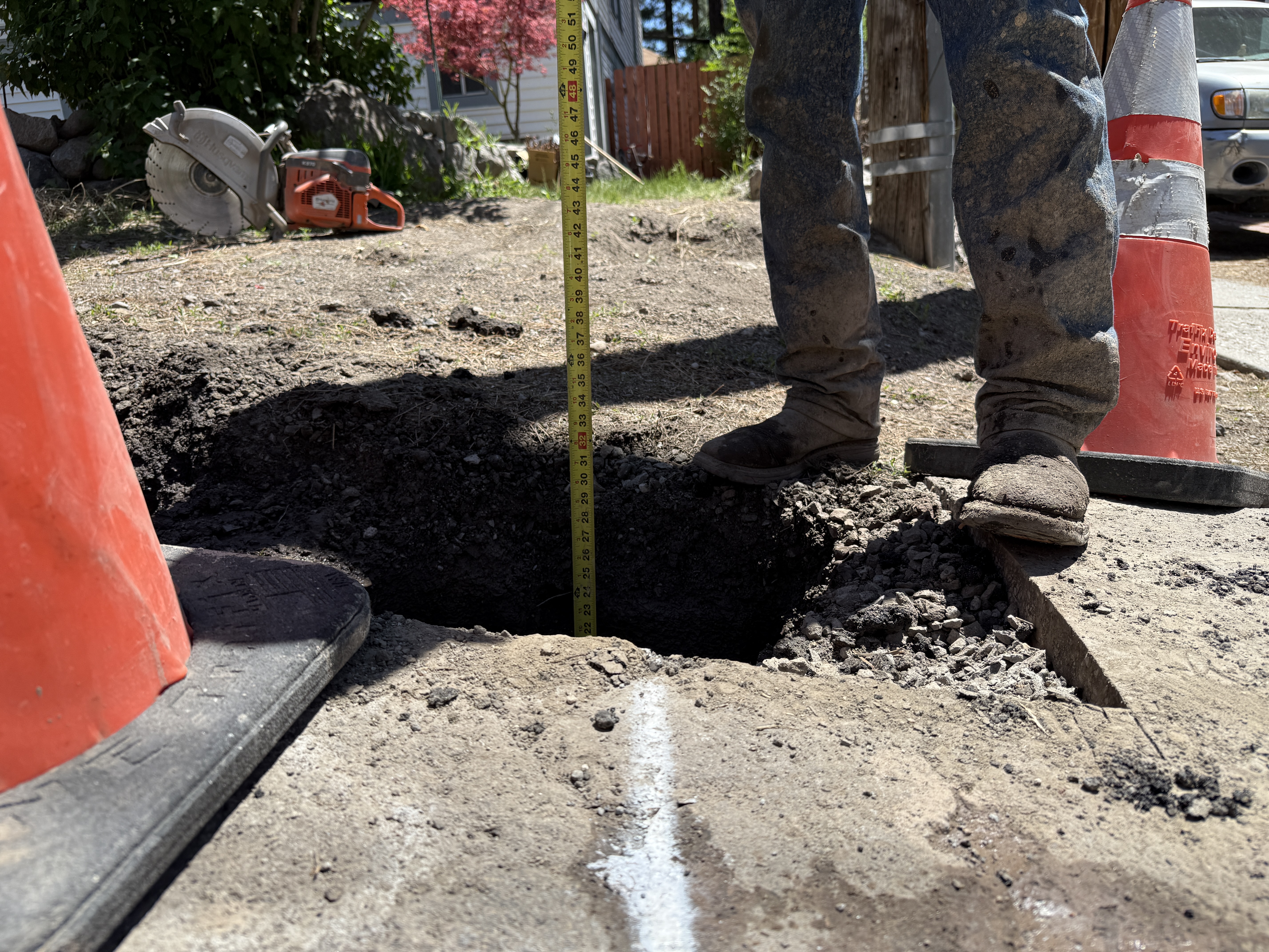 The image shows a worker measuring the depth of a freshly dug pothole, likely for utility locating purposes. An orange hand-held saw and two orange safety cones are visible around the pothole. The ground is uneven with some exposed dirt and small rubble. The scene is outdoors with natural daylight.