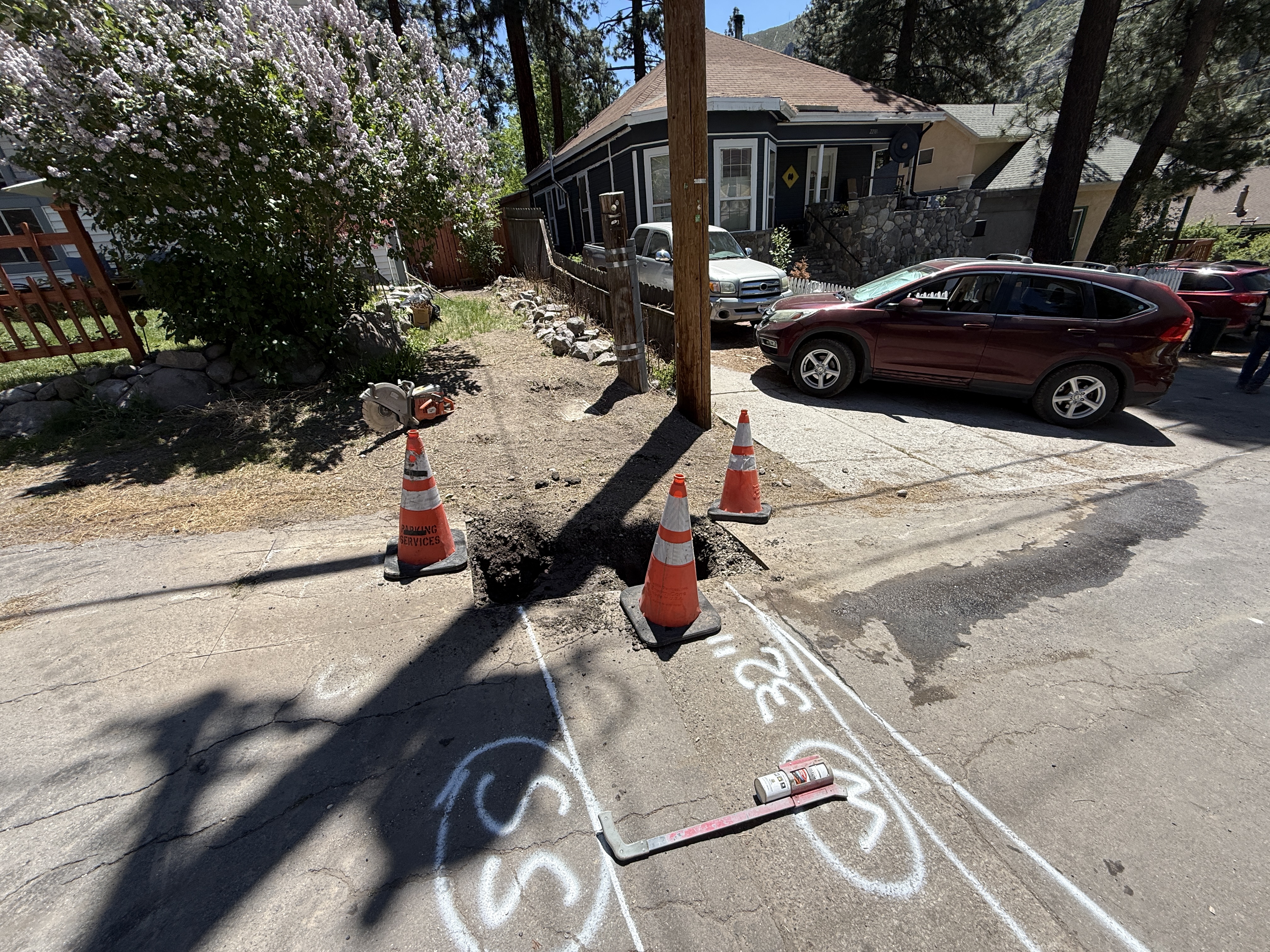 The image shows a pothole utility locating area with traffic cones placed around a small excavation. A circular saw is positioned next to a cone on the left side. The pavement has white utility markings indicating the location of underground utilities.