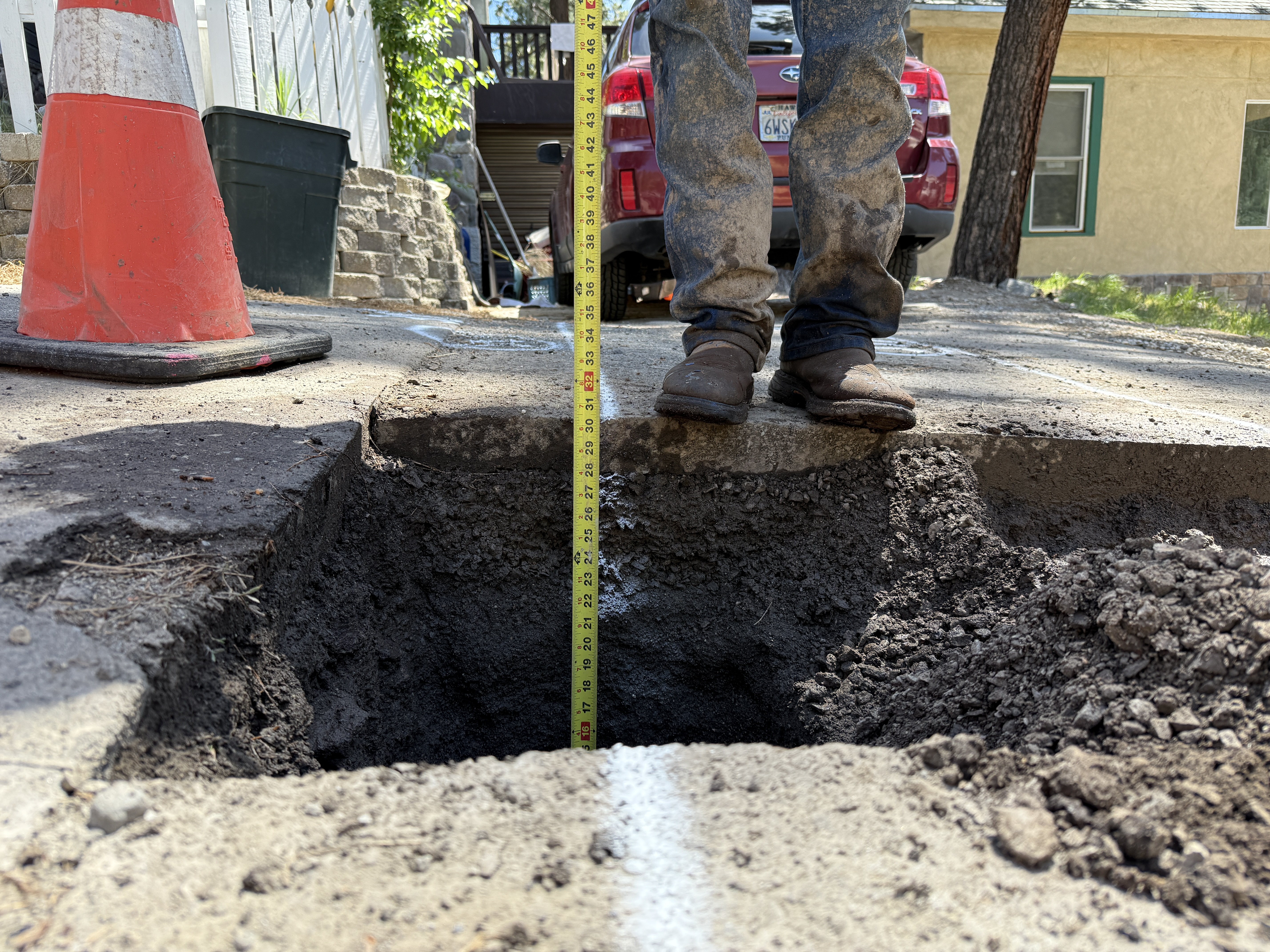 The image shows a person standing near an open trench actively measuring its depth with a tape measure. A traffic cone is placed near the edge of the trench for visibility and safety. The trench is cut into pavement, revealing soil beneath. Loose dirt is piled at the side of the trench. It's unclear what specific utility is involved in the pothole locating task.