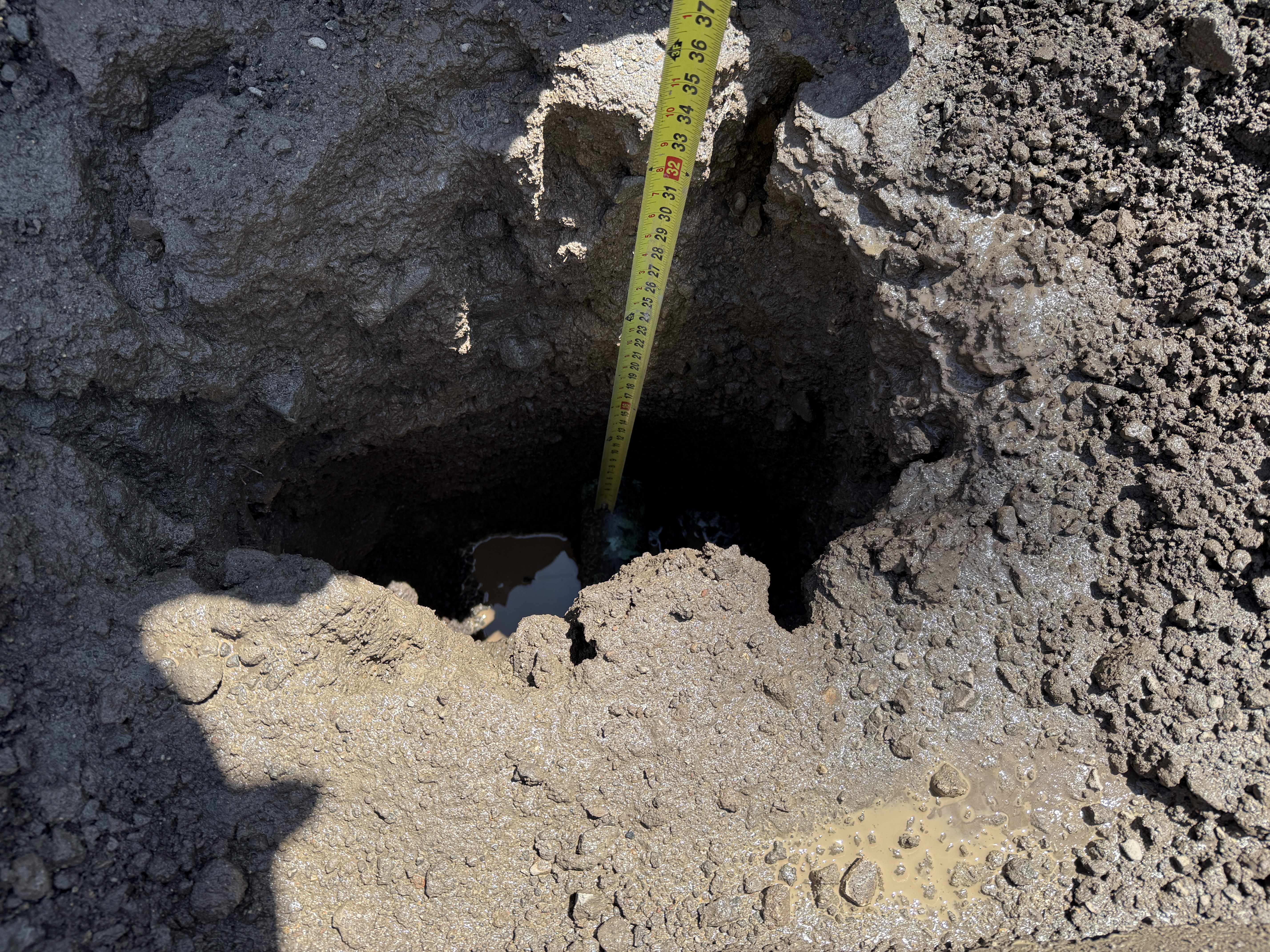 The image shows a muddy pothole with a measuring tape indicating the depth of the hole. The area is surrounded by loose and compacted soil, with some water accumulation at the bottom. No specific utilities or pipes are visible within the pothole. The purpose seems to be measuring the depth of the excavation, likely for utility locating purposes.