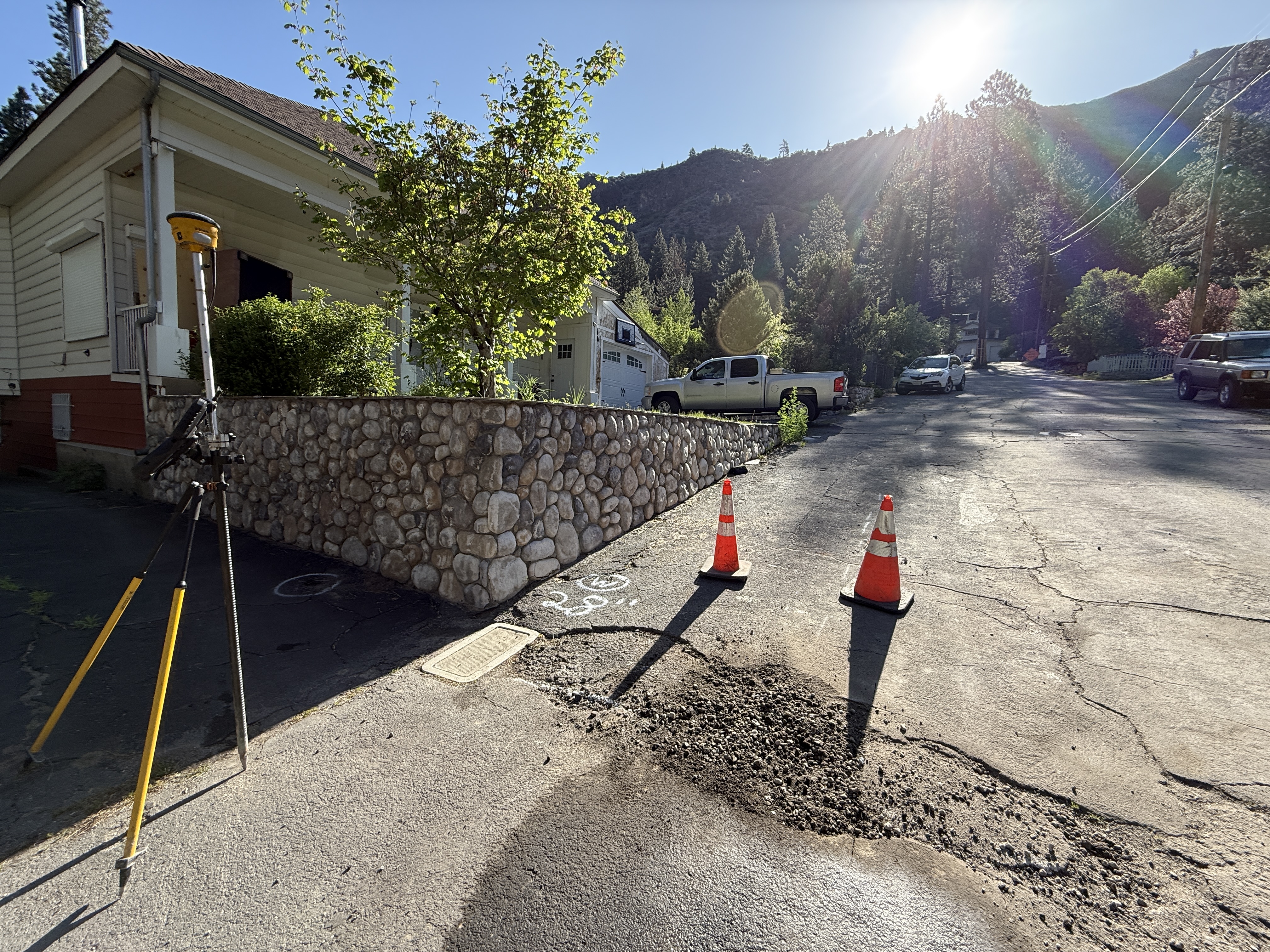 A surveying instrument on a tripod is positioned on the left side of the image, indicating survey-layout activity. Orange traffic cones are placed around a patched pothole on the asphalt road. A stone wall borders a residential property, and several vehicles are parked along the street. The scene is lit by bright sunlight, casting long shadows.