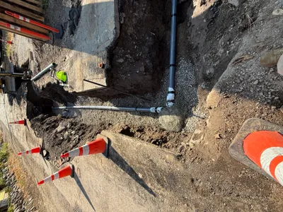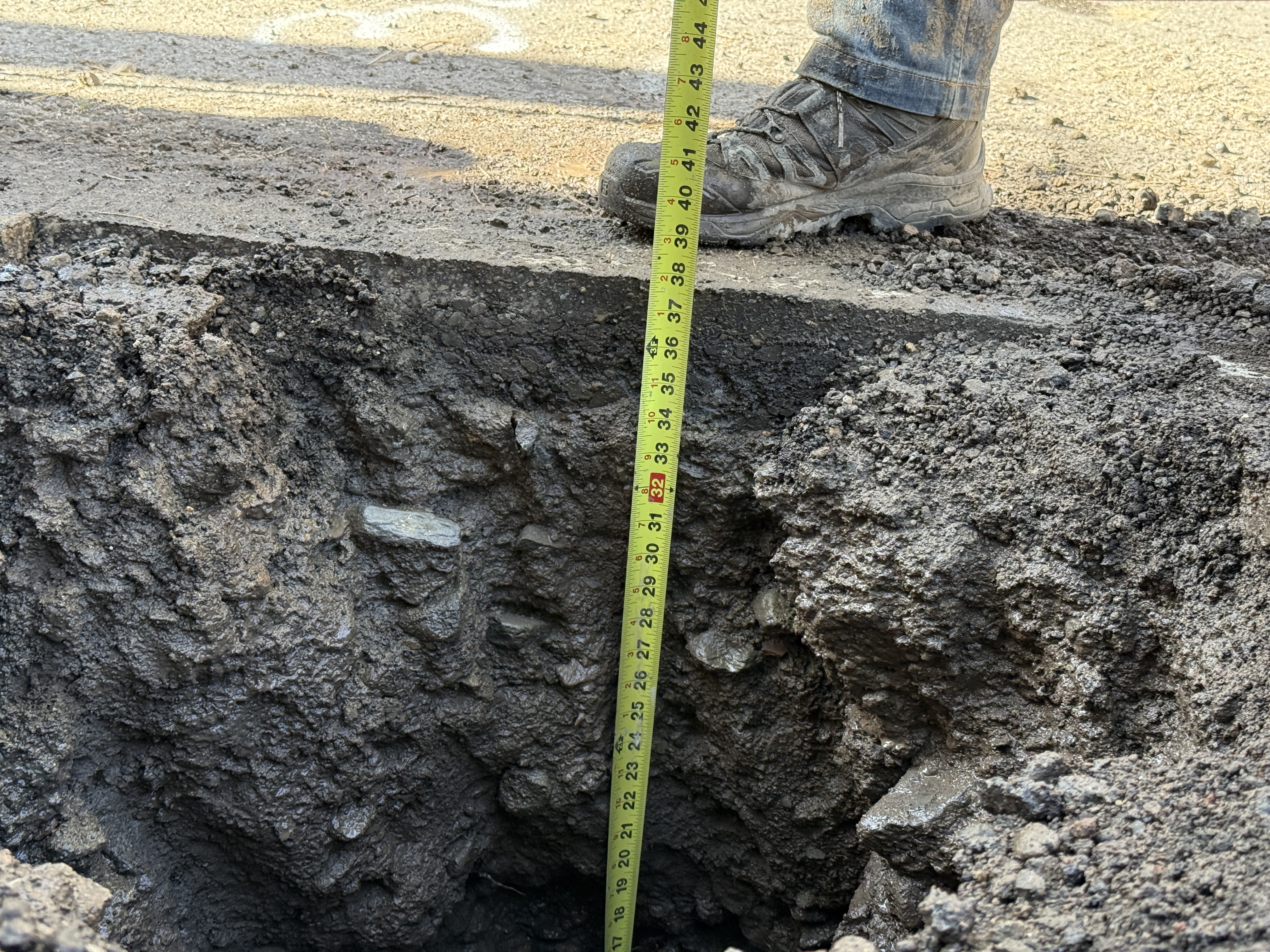 The image shows a pothole excavation with a measuring tape indicating the depth of the trench. A person is standing at the edge, wearing work boots. The soil appears compacted and the trench is unevenly cut. Depth measurement is being conducted, likely for utility locating purposes.