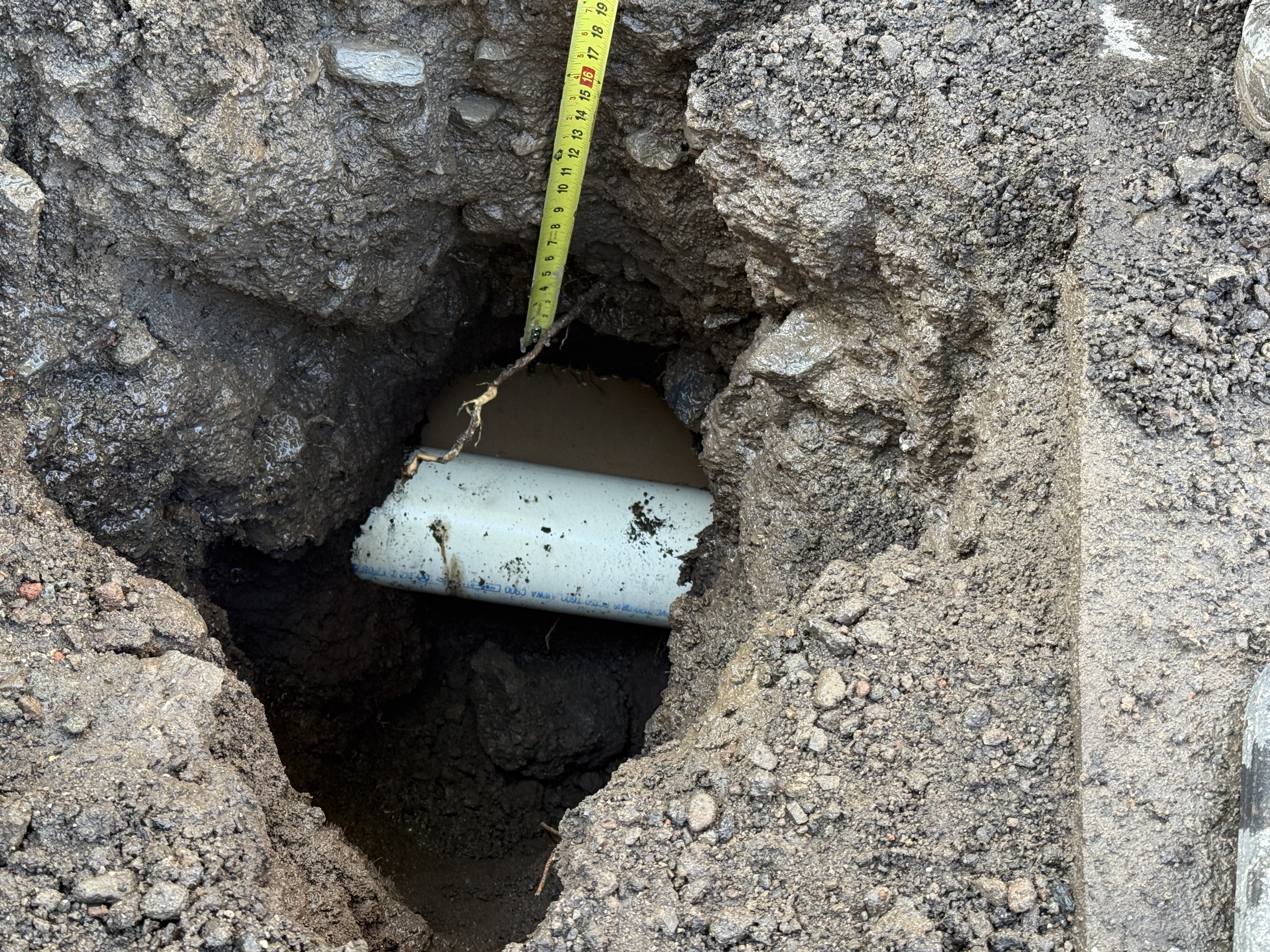 The image depicts a small excavation revealing a section of a utility pipe. A measuring tape is used to indicate the depth of the pipe. The surrounding area is soil, indicating recent digging or excavation. No safety barriers or personal protective equipment are visible.