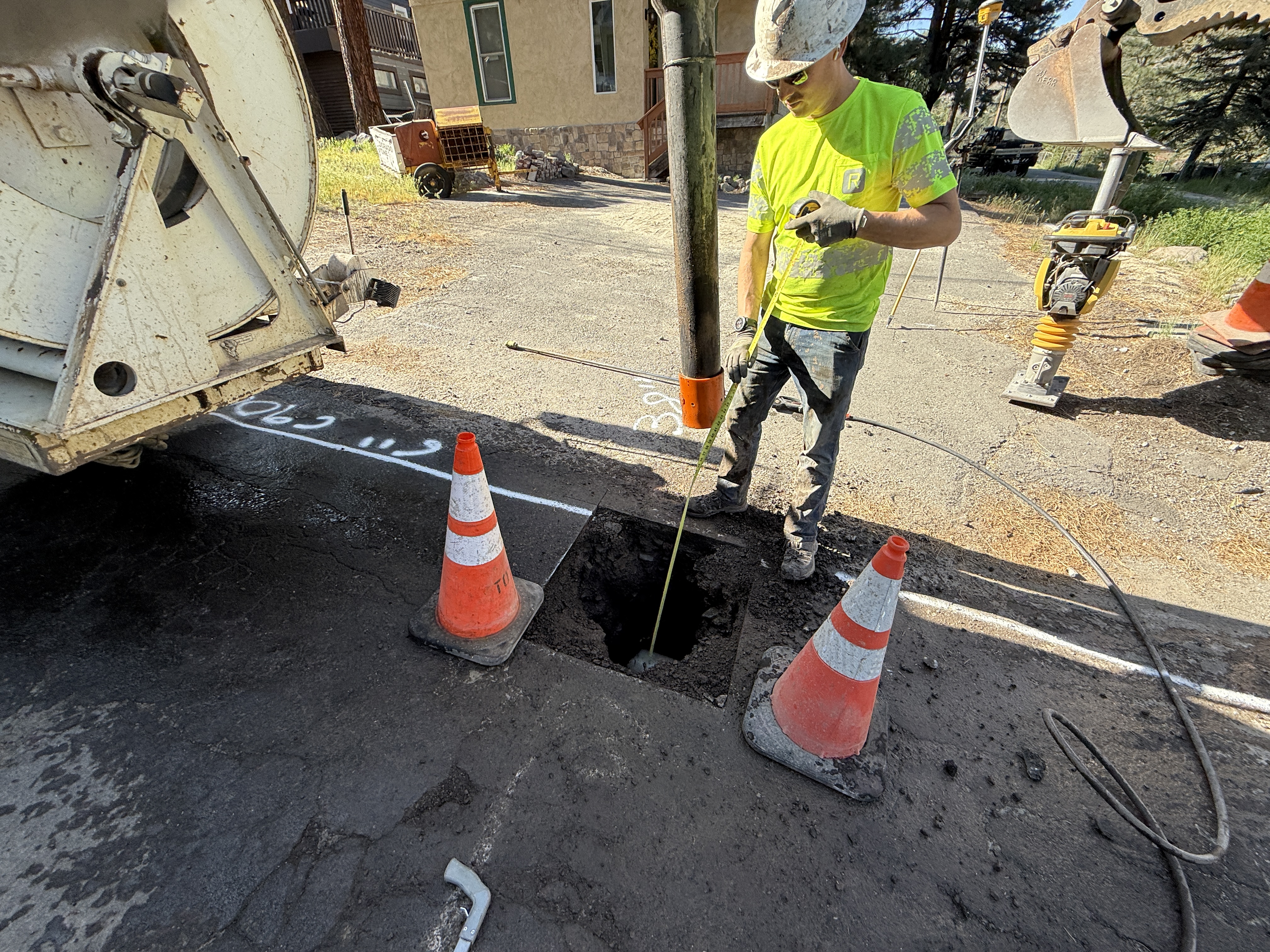 The image shows a worker wearing safety gear standing near a pothole in the pavement, using a tape measure to determine depth. Two traffic cones are placed on either side of the hole. A piece of large equipment with a cable drum is on the left, and an excavator attachment is visible to the right.