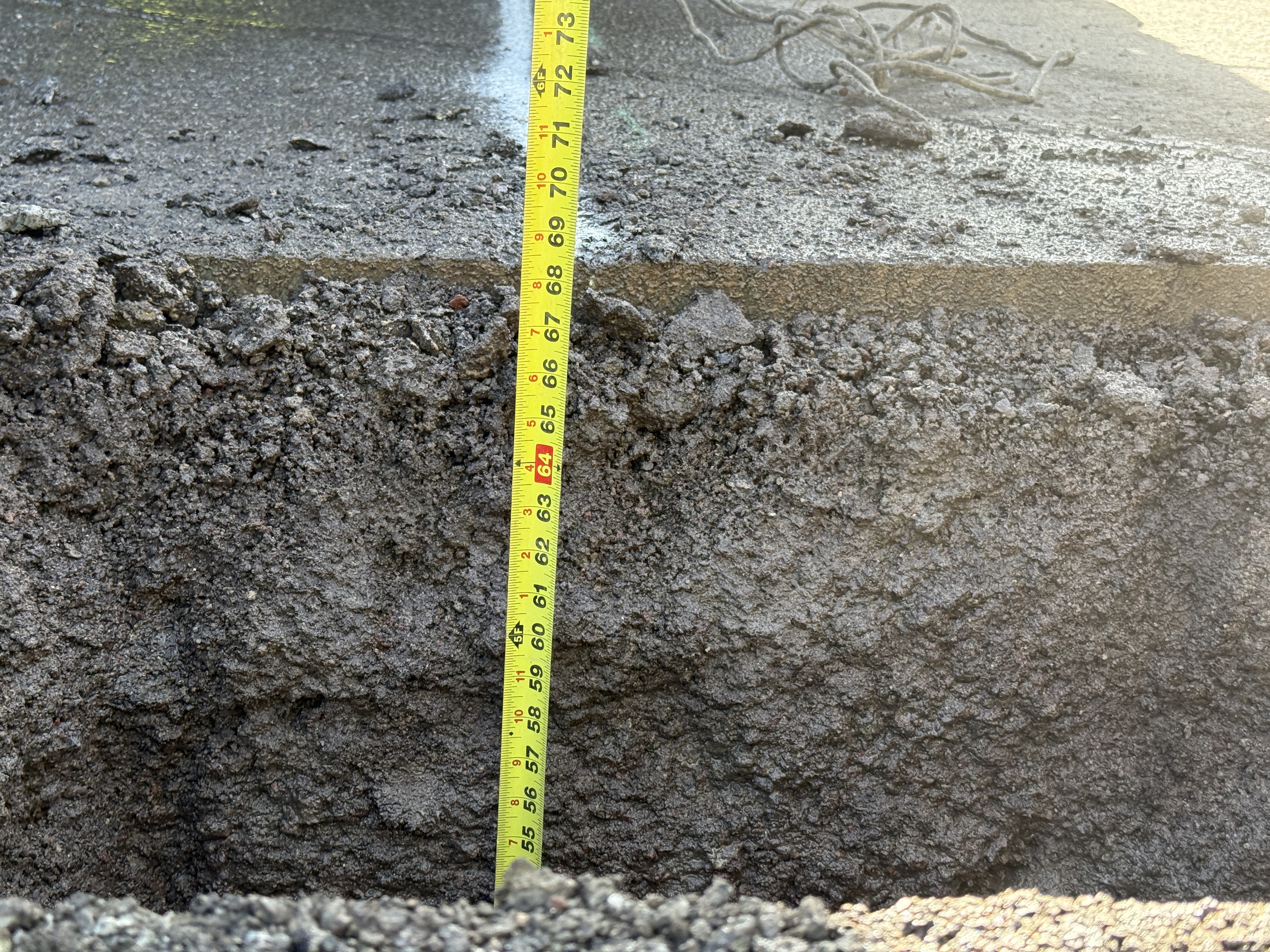 The image shows a vertical section of an excavation site, with a tape measure indicating the depth against the soil and layered material. The material appears to consist of a top layer of asphalt and underlying soil. The measuring tape displays a depth reading in the range of 55 to 73 inches approximately. Surrounding the measurement area is loose and uneven ground.