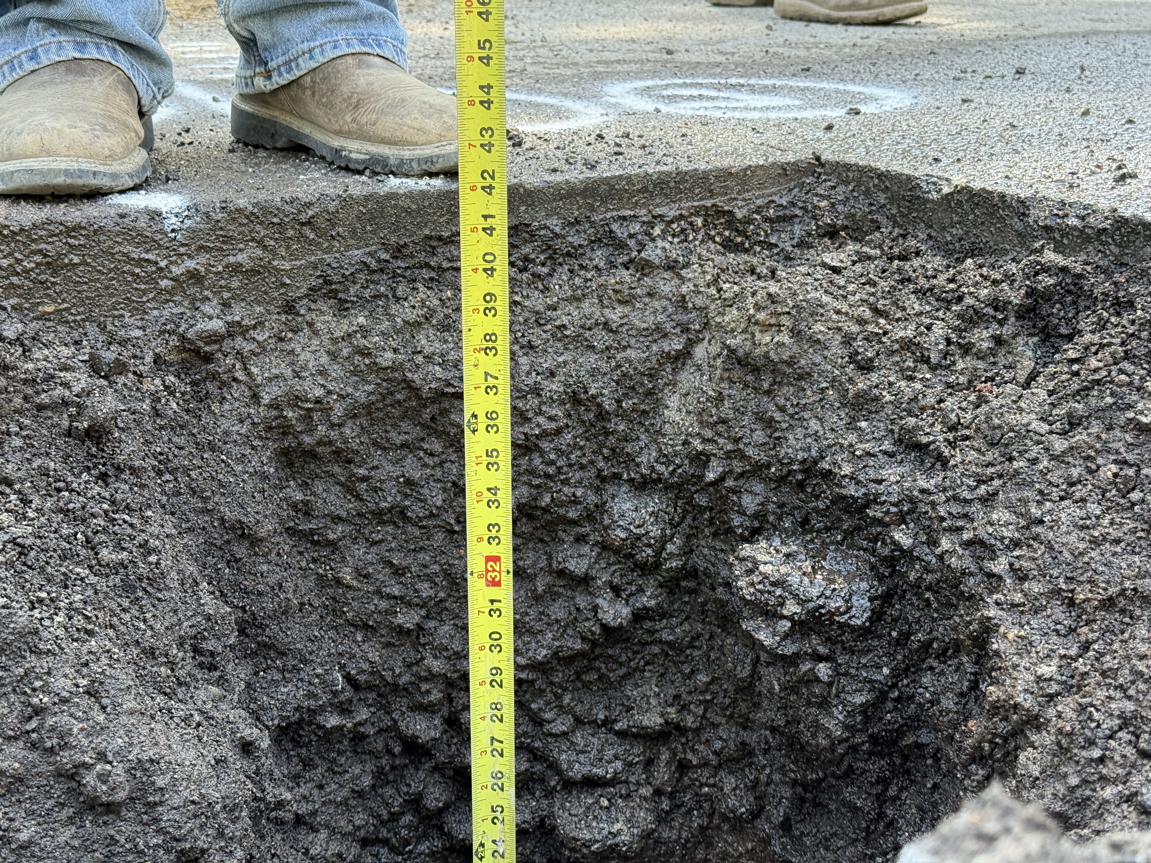 The image shows a deep excavation with a tape measure indicating depth beside the hole. The surrounding intact pavement transitions to exposed soil. Two individuals stand near the pit, wearing work boots. The excavation is situated within a paved area and does not indicate any specific piping or utilities.