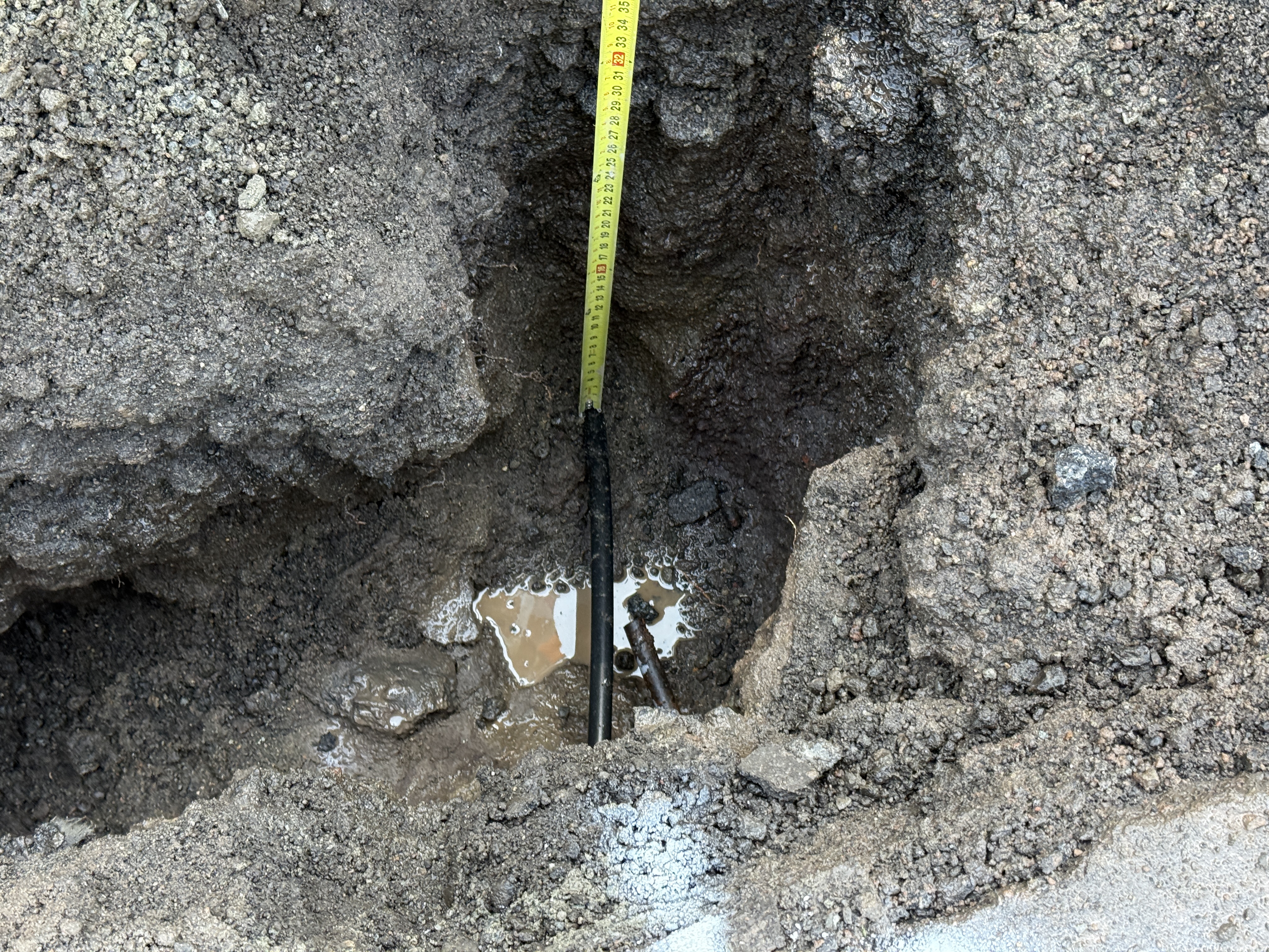 There is an open excavation with a partially exposed pipe visible in the bottom right of the frame. A measuring tape is positioned from the surface to the bottom of the excavation, likely for determining depth. The surrounding area is comprised of loose soil and some water accumulation. The activity involves utility locating through potholing.