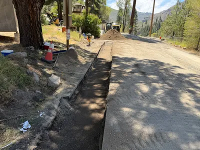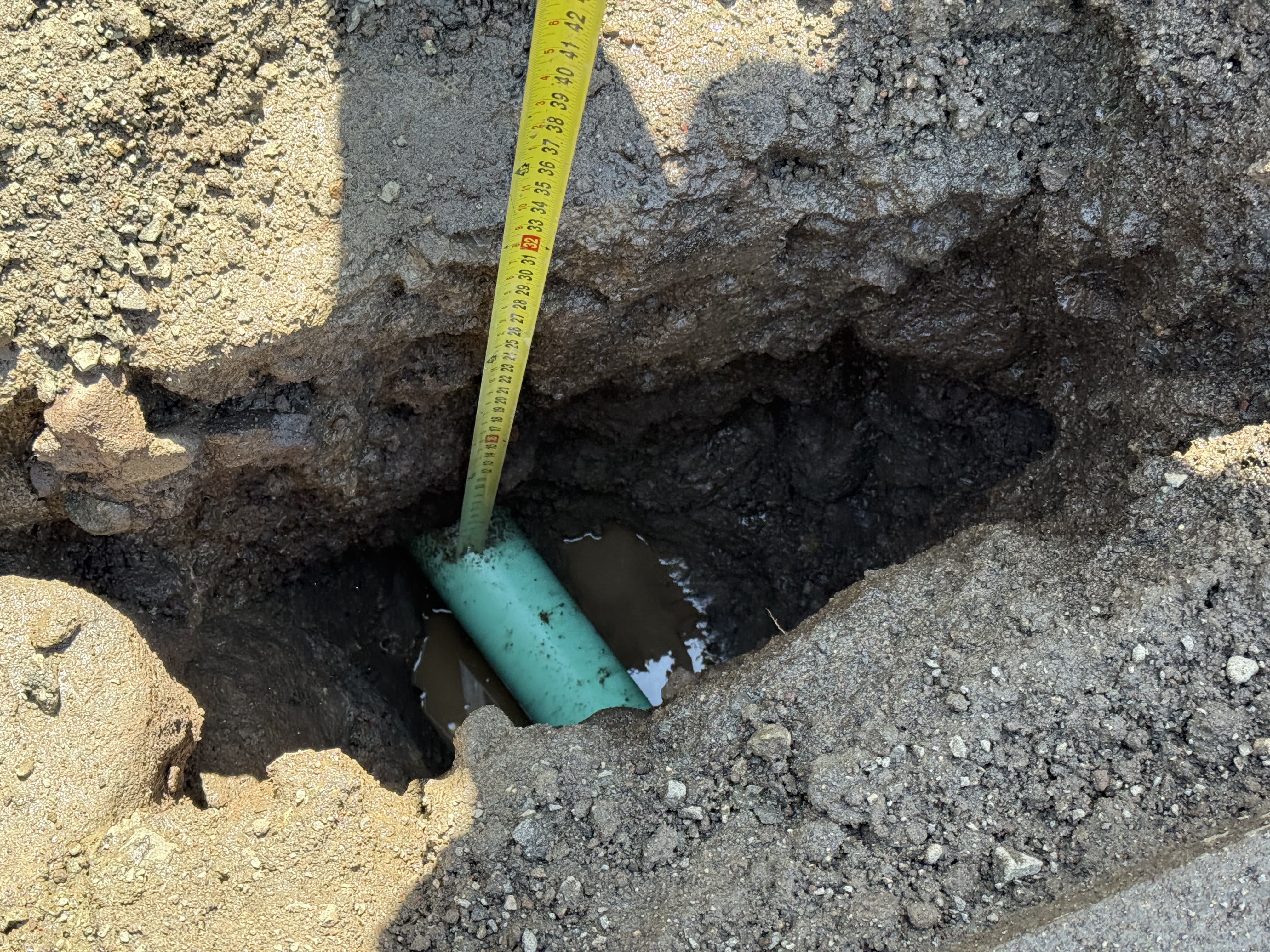The image shows an excavated area containing a green-colored utility pipe exposed for inspection. A measuring tape is visible extending from the top of the excavation down to the pipe. The surrounding area consists of a mix of soil and small gravel with some moisture present near the pipe. The focus appears to be on measuring the depth of the pipe as part of utility locating activities.