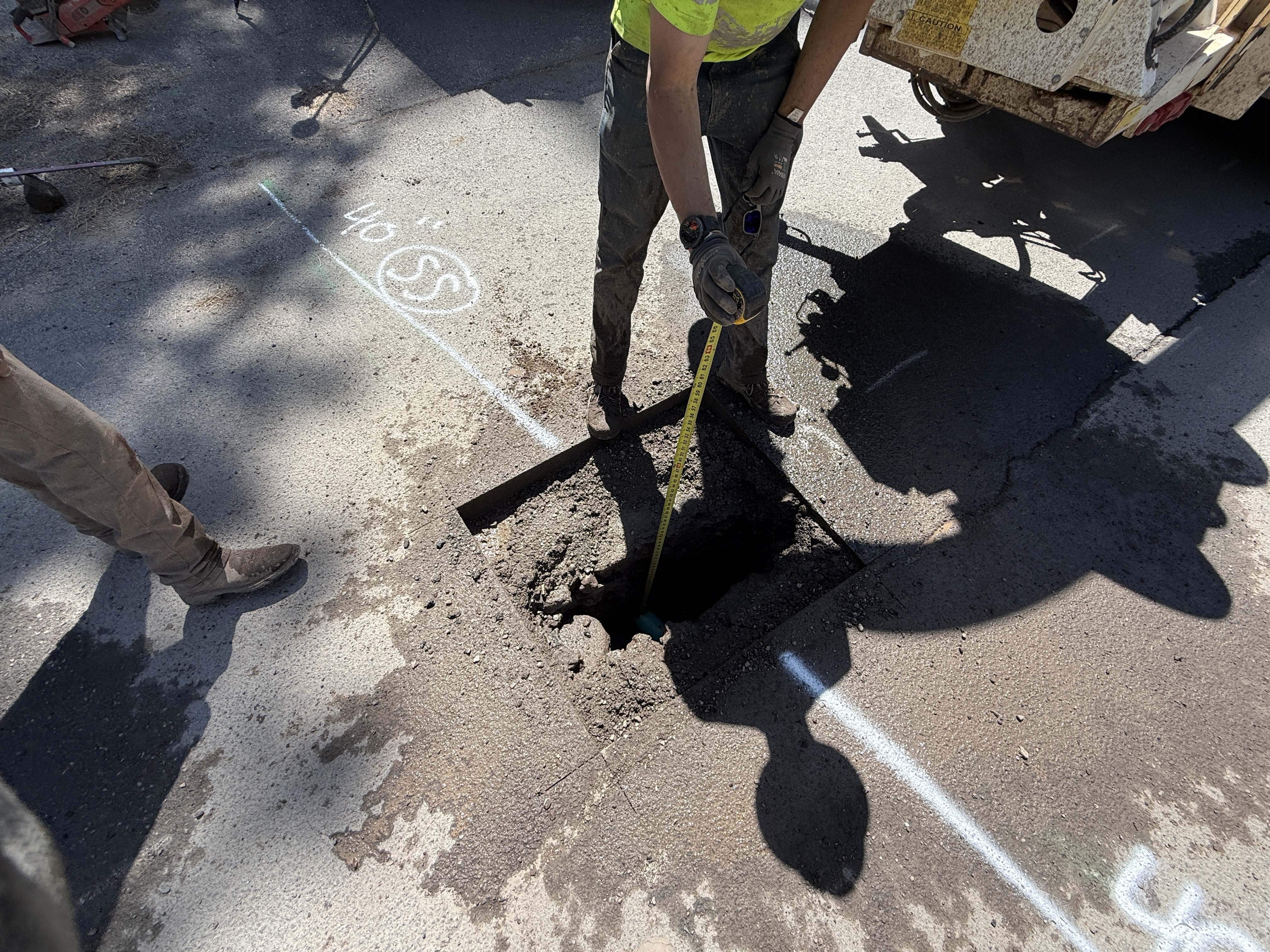 The image shows a worker standing on a paved roadway, measuring a pothole with a tape measure. Another person is partially visible, standing nearby. Markings on the pavement indicate measurement or location reference points. A vehicle shadow is cast on the ground, suggesting proximity to equipment or a truck.
