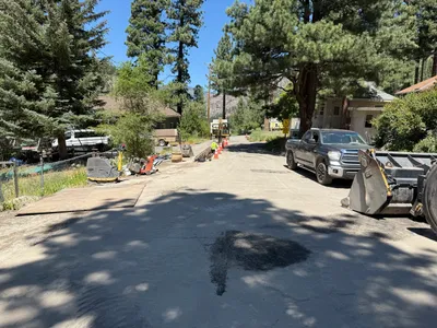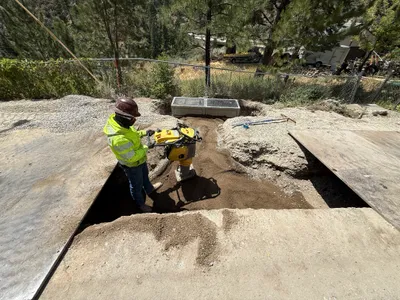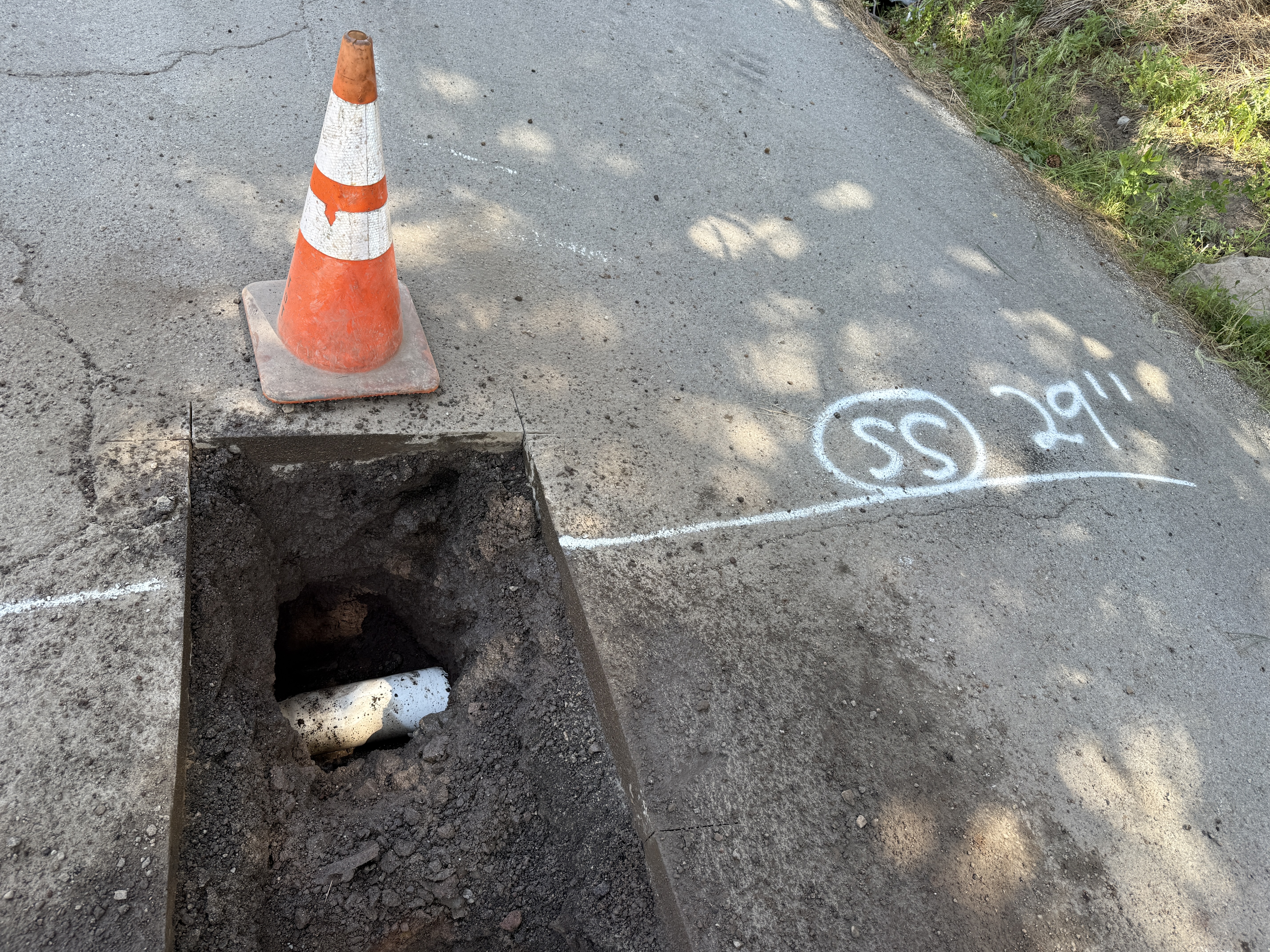 The image shows a rectangular pothole cut into a concrete surface with soil and an exposed pipe inside. An orange traffic cone is placed next to the pothole, suggesting ongoing work. White markings on the pavement, including 'SS', are visible near the excavation. The context suggests utility location work but specific utility type is uncertain.