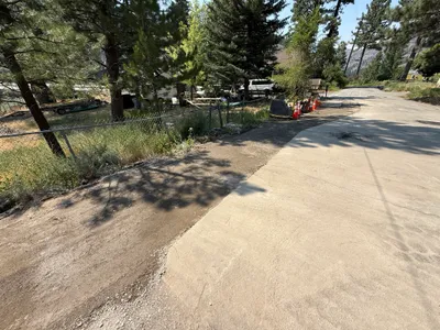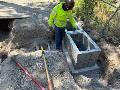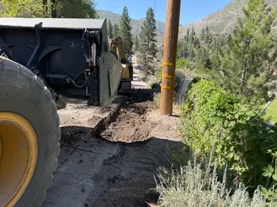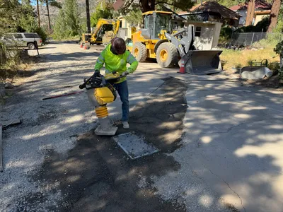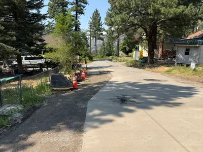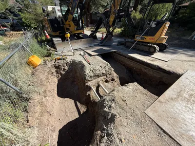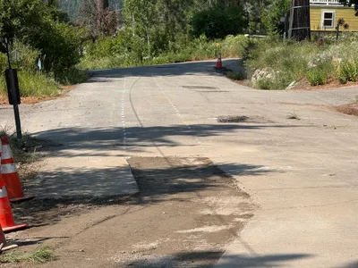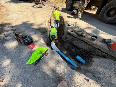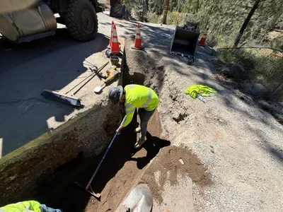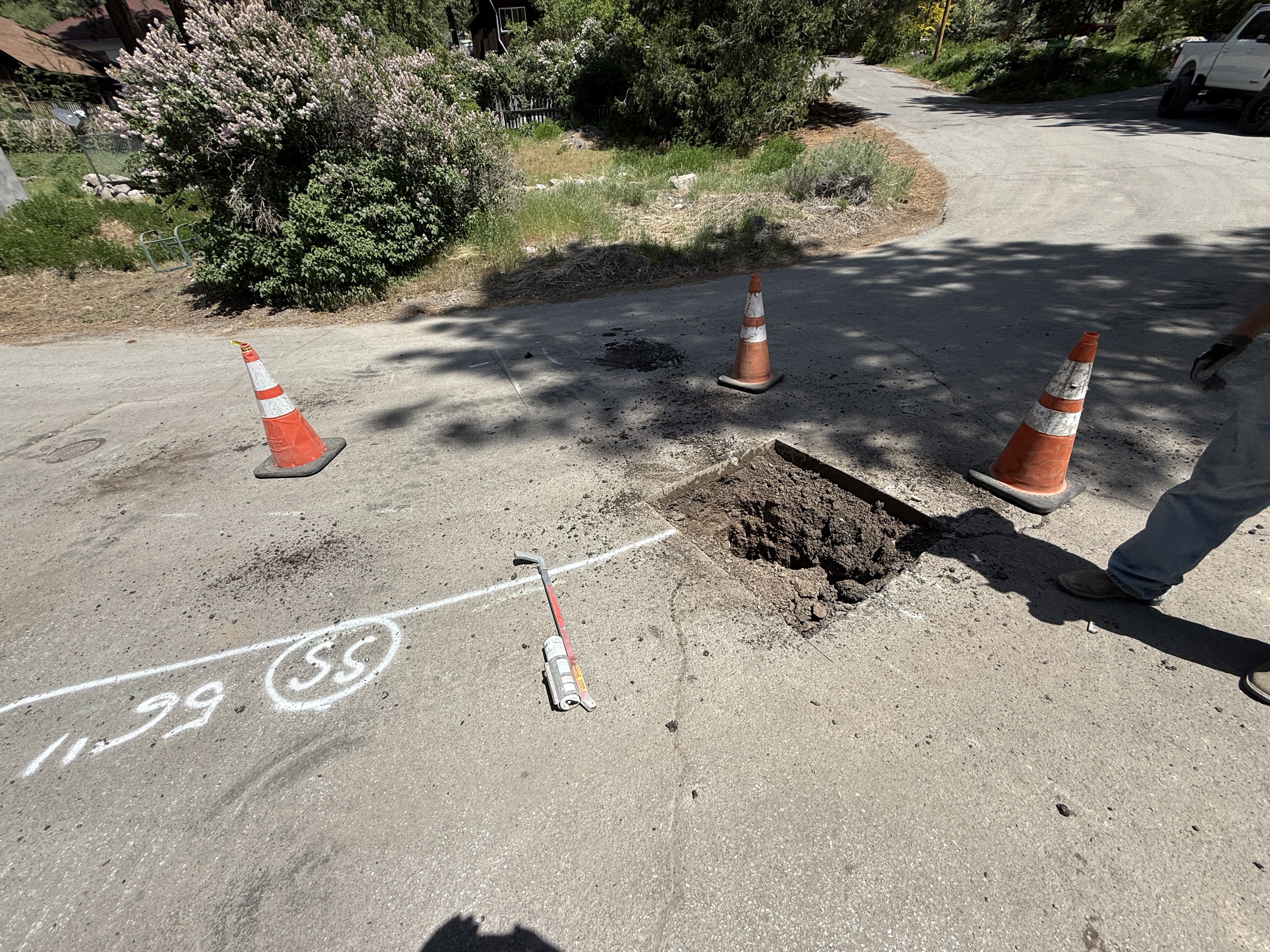 The image shows an excavated pothole in the middle of a paved road, likely for utility locating purposes. Three traffic cones are placed around the pothole, and a hand tool is lying on the ground nearby. The ground around the pothole shows some loose soil, indicating recent excavation. The edge of a vehicle is visible on the right side, suggesting possibly ongoing work.