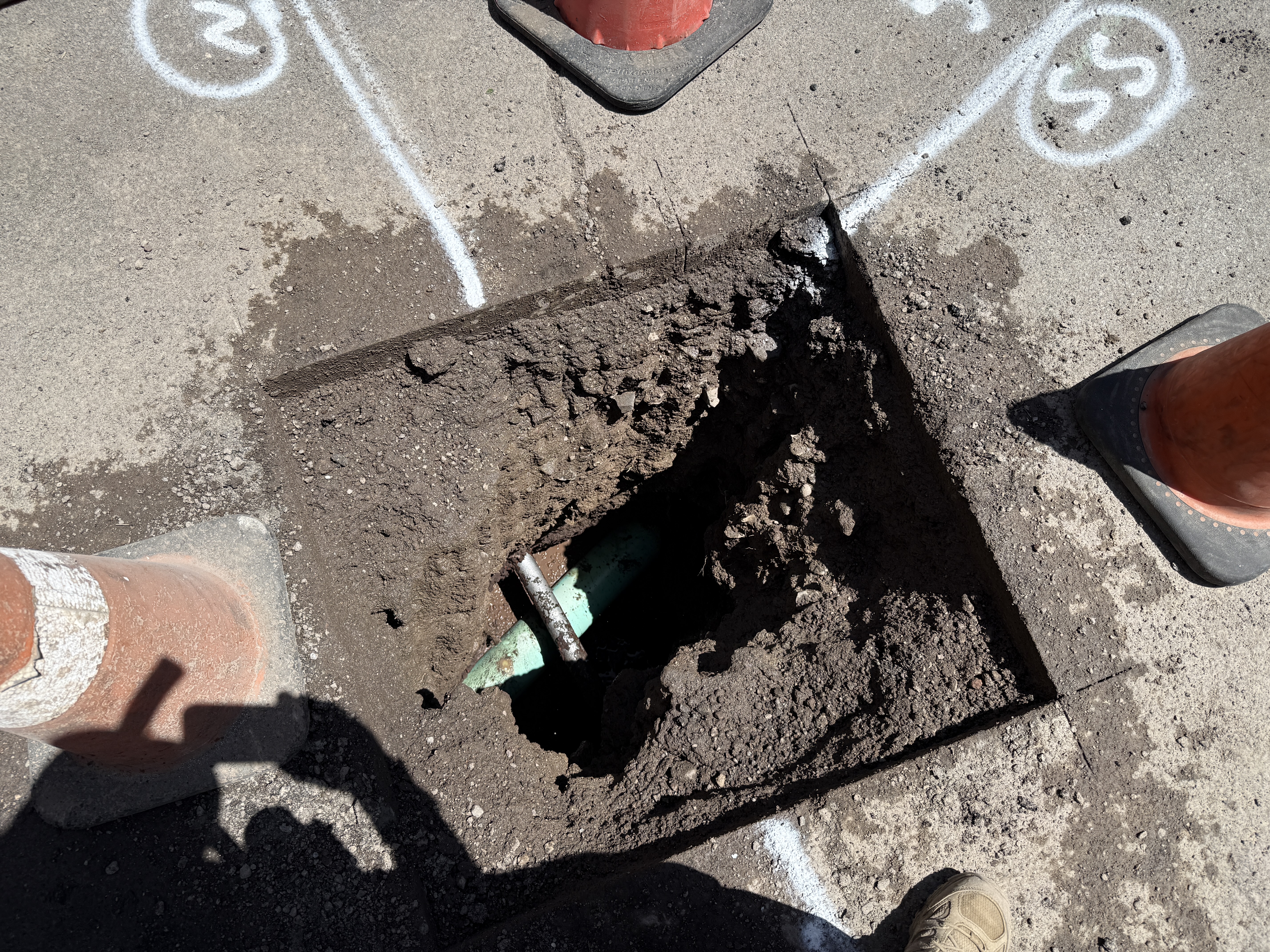 The image shows a pothole excavation with a green pipe partially exposed beneath the soil. The excavation is square-shaped and surrounded by intact pavement. Traffic cones are positioned around the pothole to indicate its location and enhance safety. White paint markings on the pavement suggest utility locating activities. The work area appears clean and organized, with no heavy machinery visible in the frame.