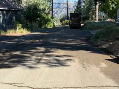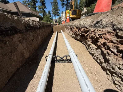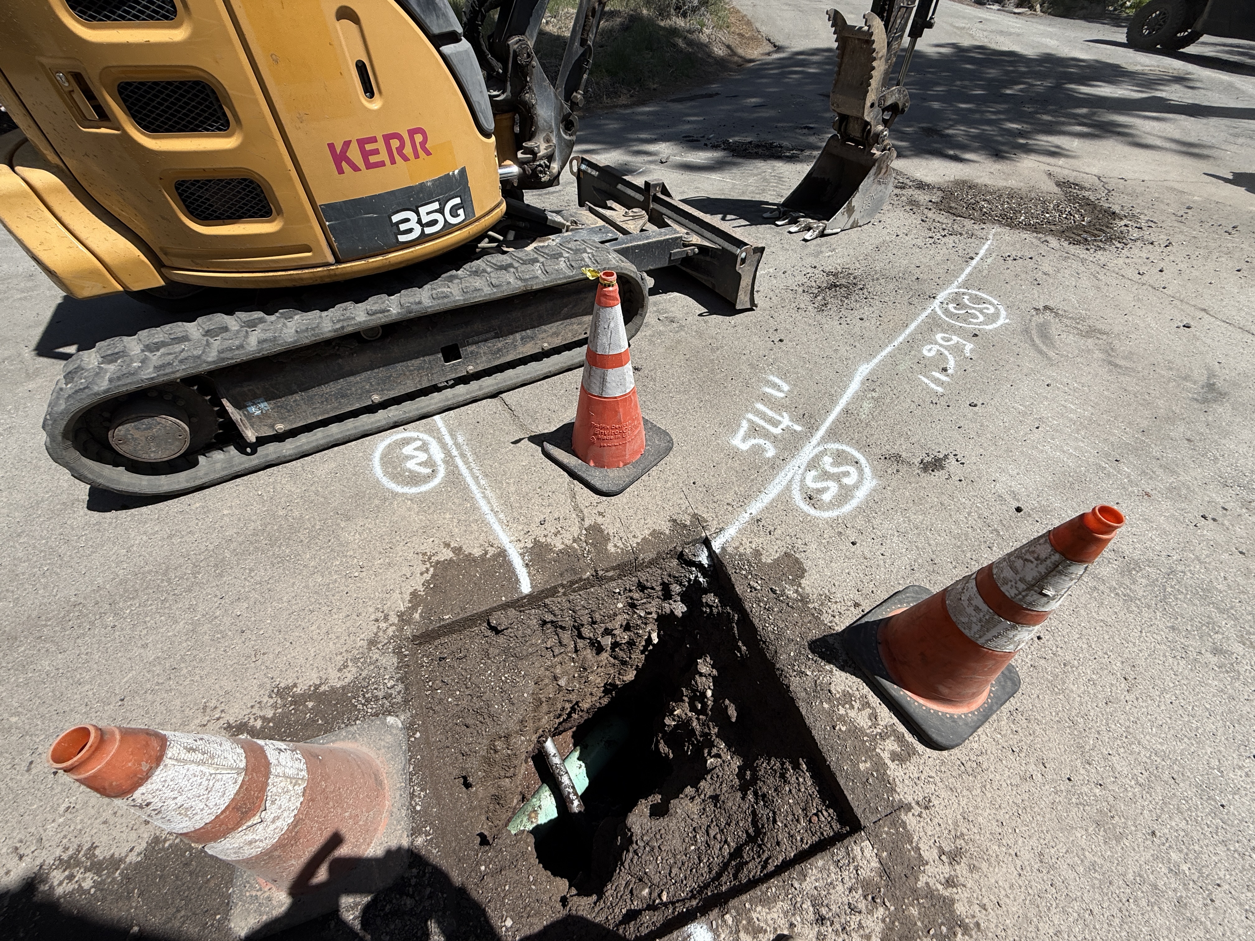 The image shows an ongoing pothole utility locating operation. An excavator with caterpillar tracks labeled 'Kerr' is parked near a small excavated hole in the pavement. Traffic cones are placed around the hole for safety, and utility markings are visible on the concrete surface indicating measurements and possible utility routes. These markings suggest the identification of subsurface utilities.
