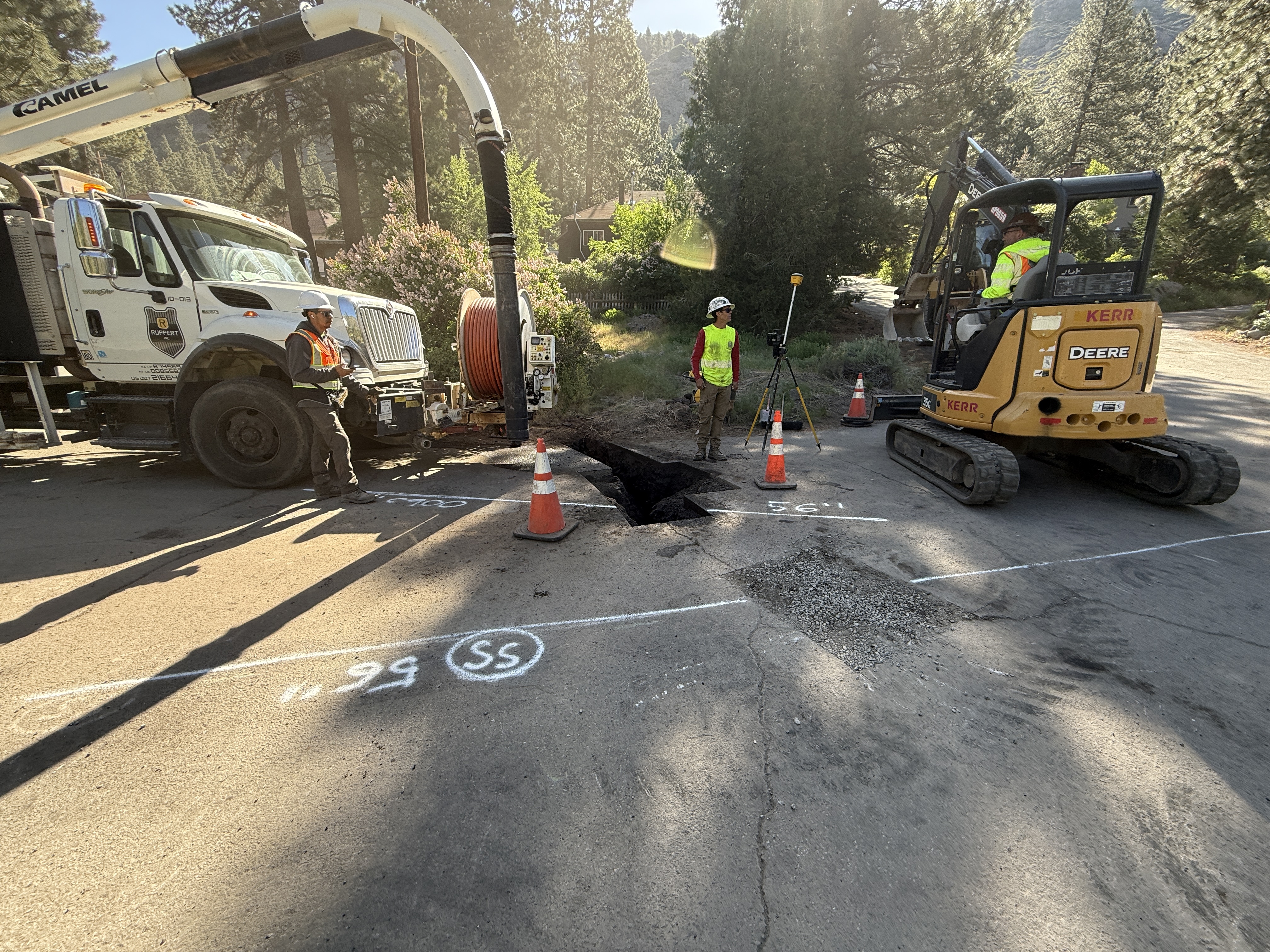 The image shows a crew performing pothole utility locating on a paved street. A vacuum truck is parked on the left with a hose extending toward the ground, likely used for soil extraction. A mini excavator is positioned on the right, with its arm over the excavation. Two workers are present, one holding a tool or device nearby and another operating the excavator. The ground is marked with spray paint and surrounded by traffic cones, indicating ongoing excavation or inspection work.