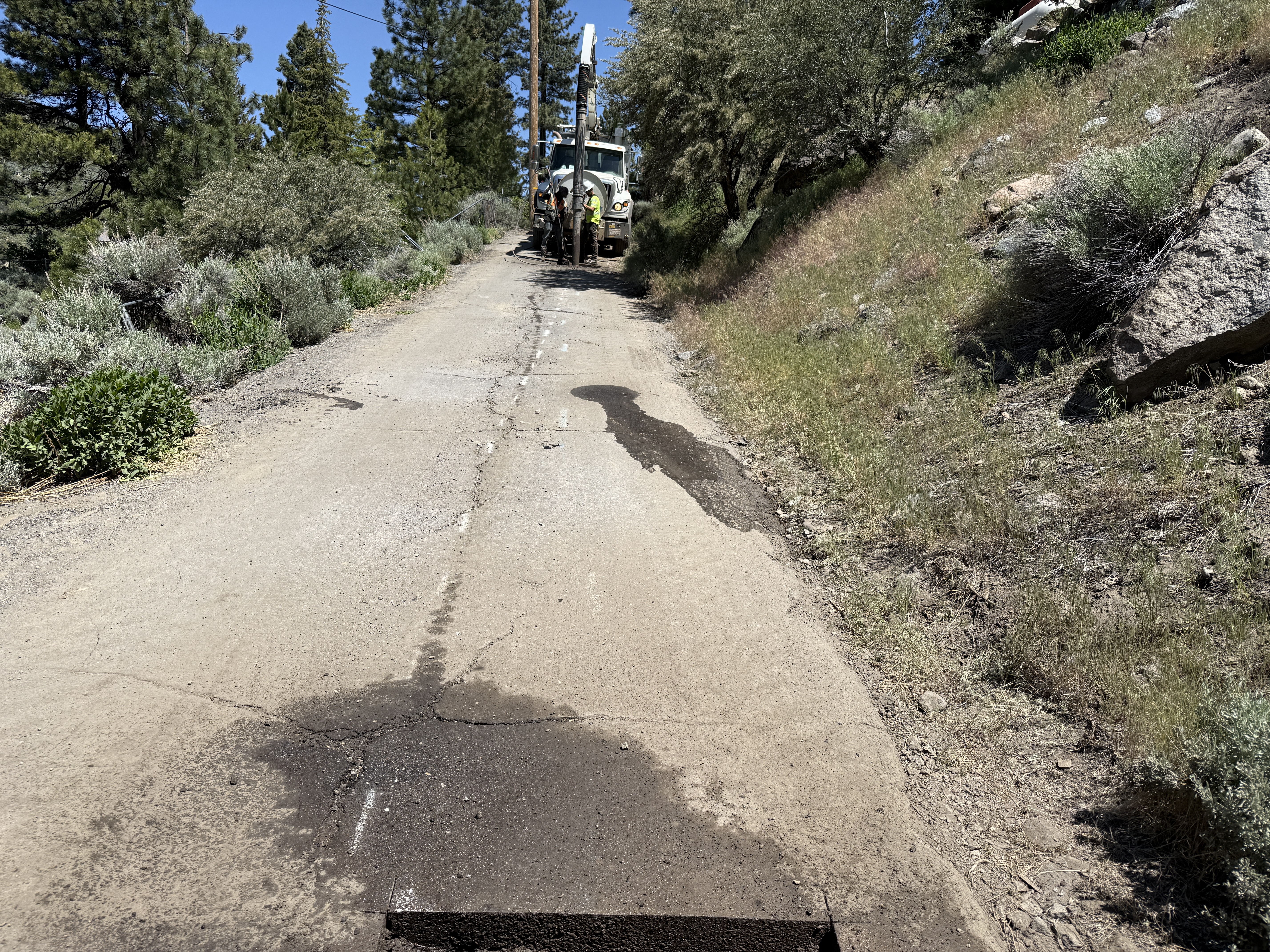 The image shows a sloped, narrow paved road with a utility truck parked on it. Two workers appear to be engaged in utility locating near the truck, with some digging evident by the dark patches on the pavement. Vegetation and a hillside are visible on either side of the road.