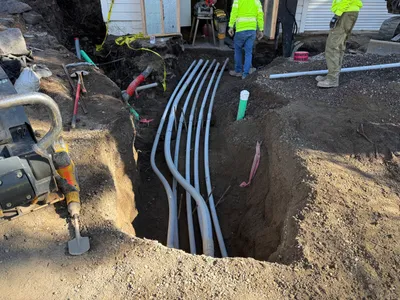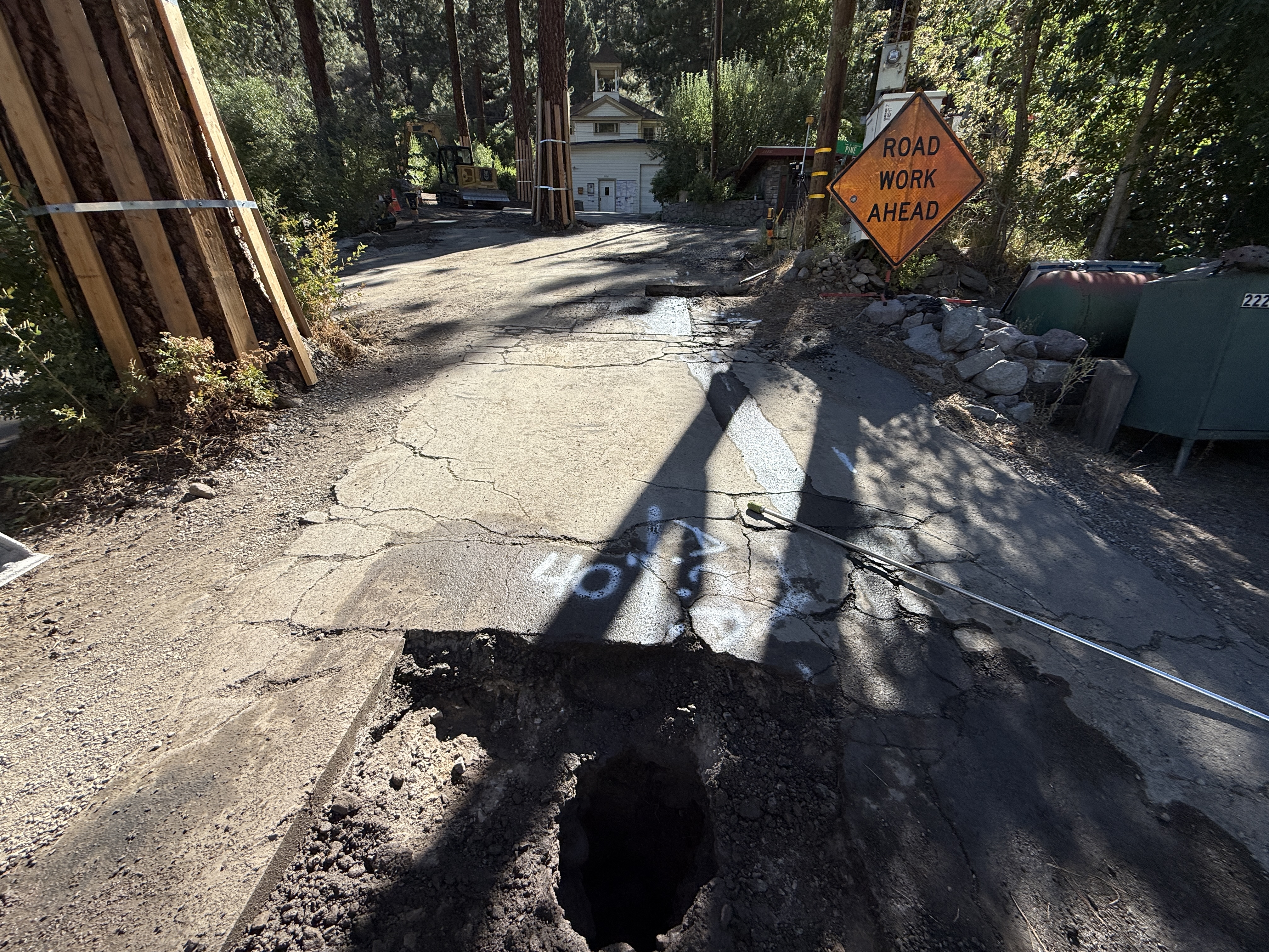 The image shows a pothole in a cracked asphalt road, indicating utility locating work. A 'road work ahead' sign is visible on the right side, suggesting ongoing construction. Wood structures are supporting nearby trees, and construction equipment is seen further down the road.