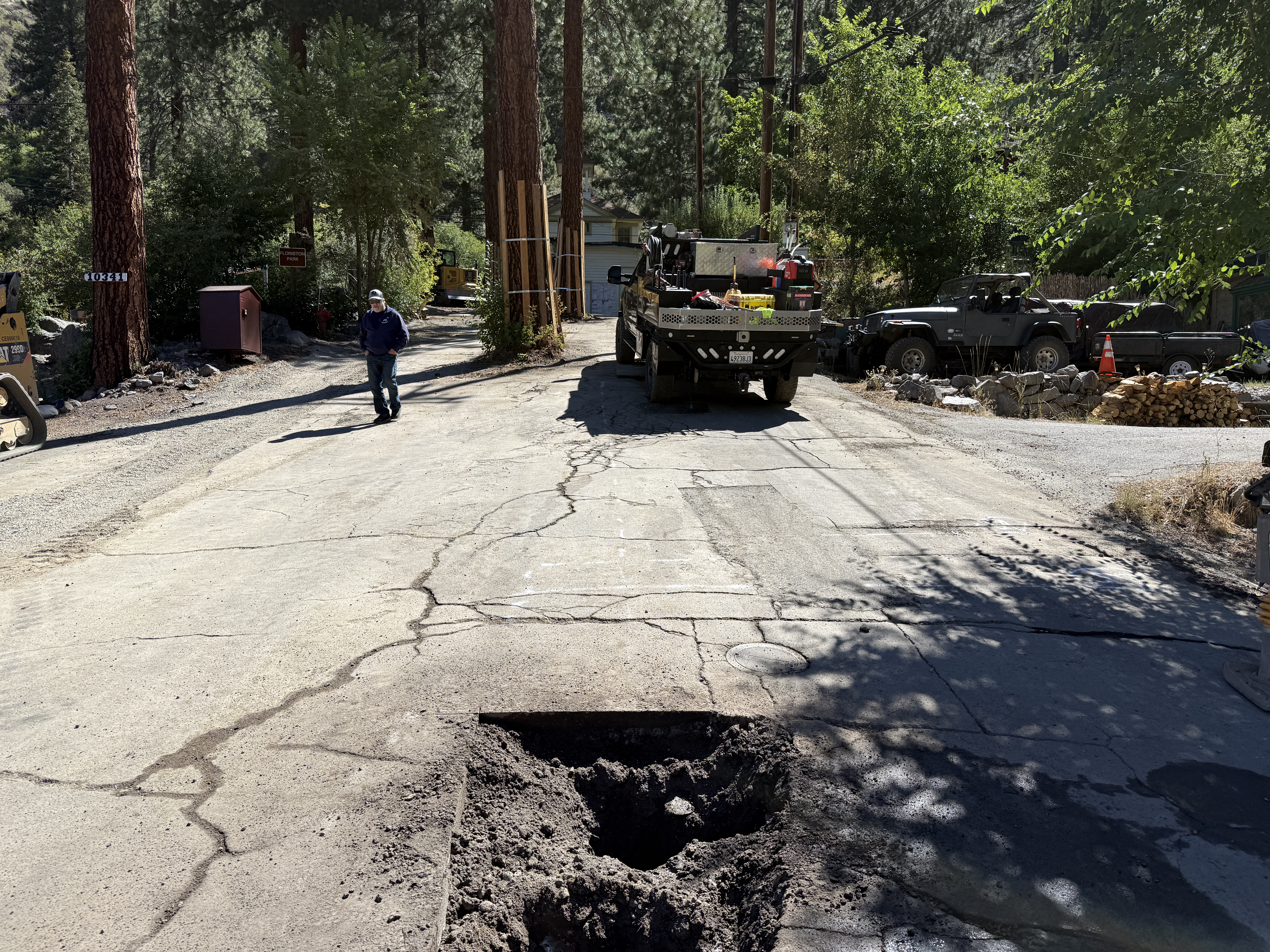cracked paved road with an open pothole clear weather with bright sunlight and some shadow limited congestion with nearby vehicles and equipment