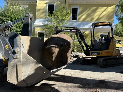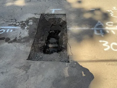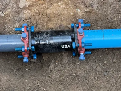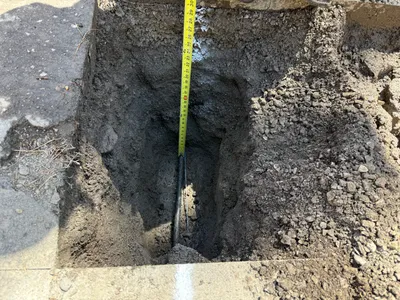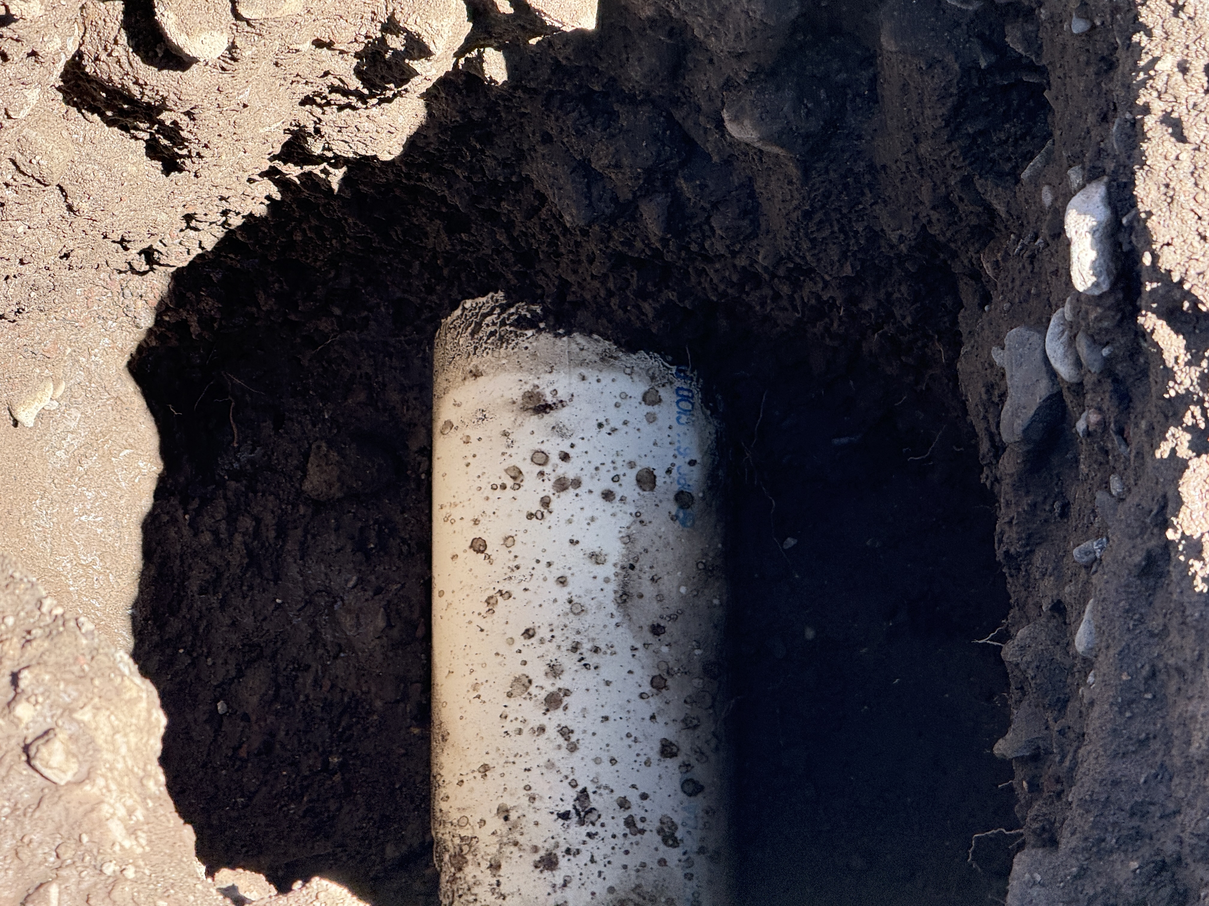 The image shows a section of a white pipe exposed in a dug-out area, surrounded by dark soil. The soil appears compact and there is no other material or equipment visibly present. The pipe is underground, suggesting utility work. The lighting is bright, indicating daylight conditions.