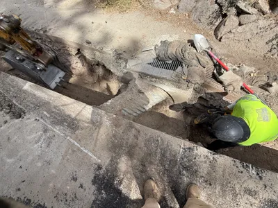 The image shows an area of road pavement with a pothole that has been partially excavated. A traffic cone is positioned on the pavement to the left of the open trench. There is white spray paint marking on the pavement indicating a possible utility location. The surface is a mixture of compact soil and asphalt debris where the excavation is occurring.