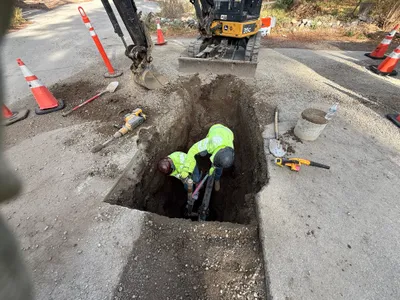 The image shows a rectangular pothole excavation on a paved area, with loose soil and debris surrounding the opening. A pair of work boots is visible near the edge, indicating the presence of a worker. No utilities or pipes are visibly seen inside the hole. The surrounding area appears to be clear of equipment and significant obstacles.