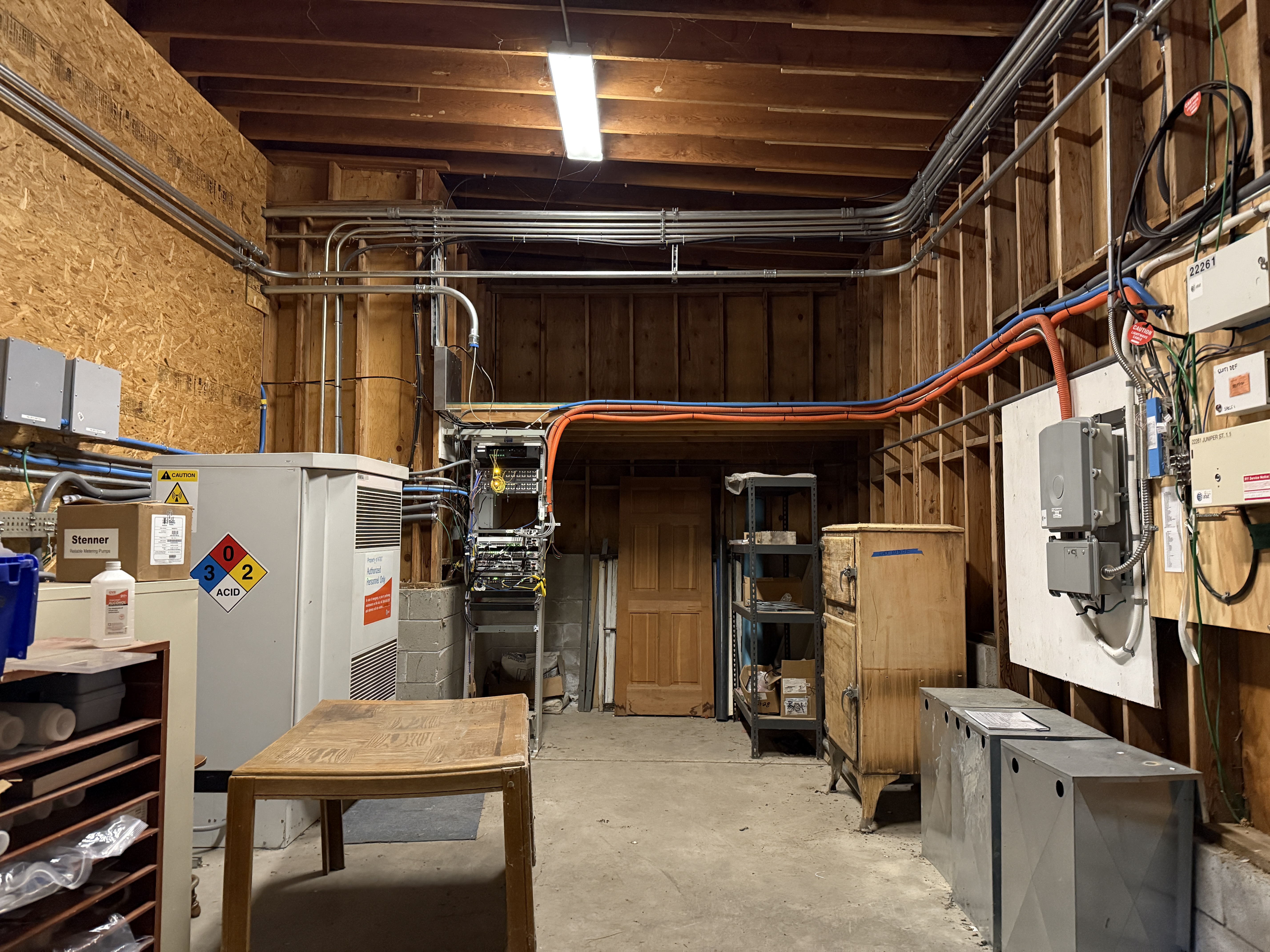The image shows an interior utility room with electrical and control equipment. Conduits and cables are running along the walls and ceiling. A large electrical panel with hazard labels is prominently visible. Various shelving units and storage cabinets are in the background. The room has unfinished wooden walls and concrete flooring, with a single overhead fluorescent light providing illumination.