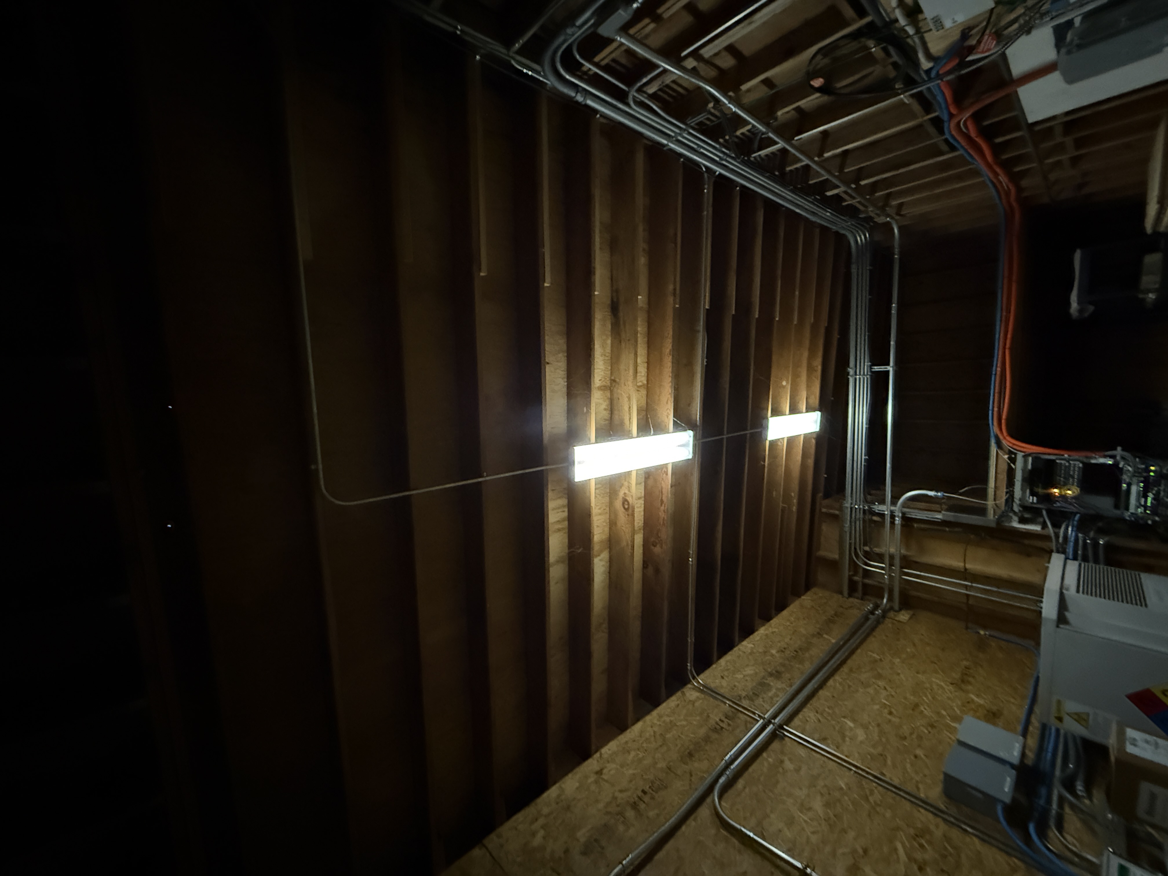 The image shows an interior space with exposed wooden ceiling beams and fluorescent overhead lighting. Electrical conduits run along the walls and ceiling, leading to various panels and equipment visible in the room. The space appears organized, with cabling and electrical infrastructure prominently displayed against plywood walls.