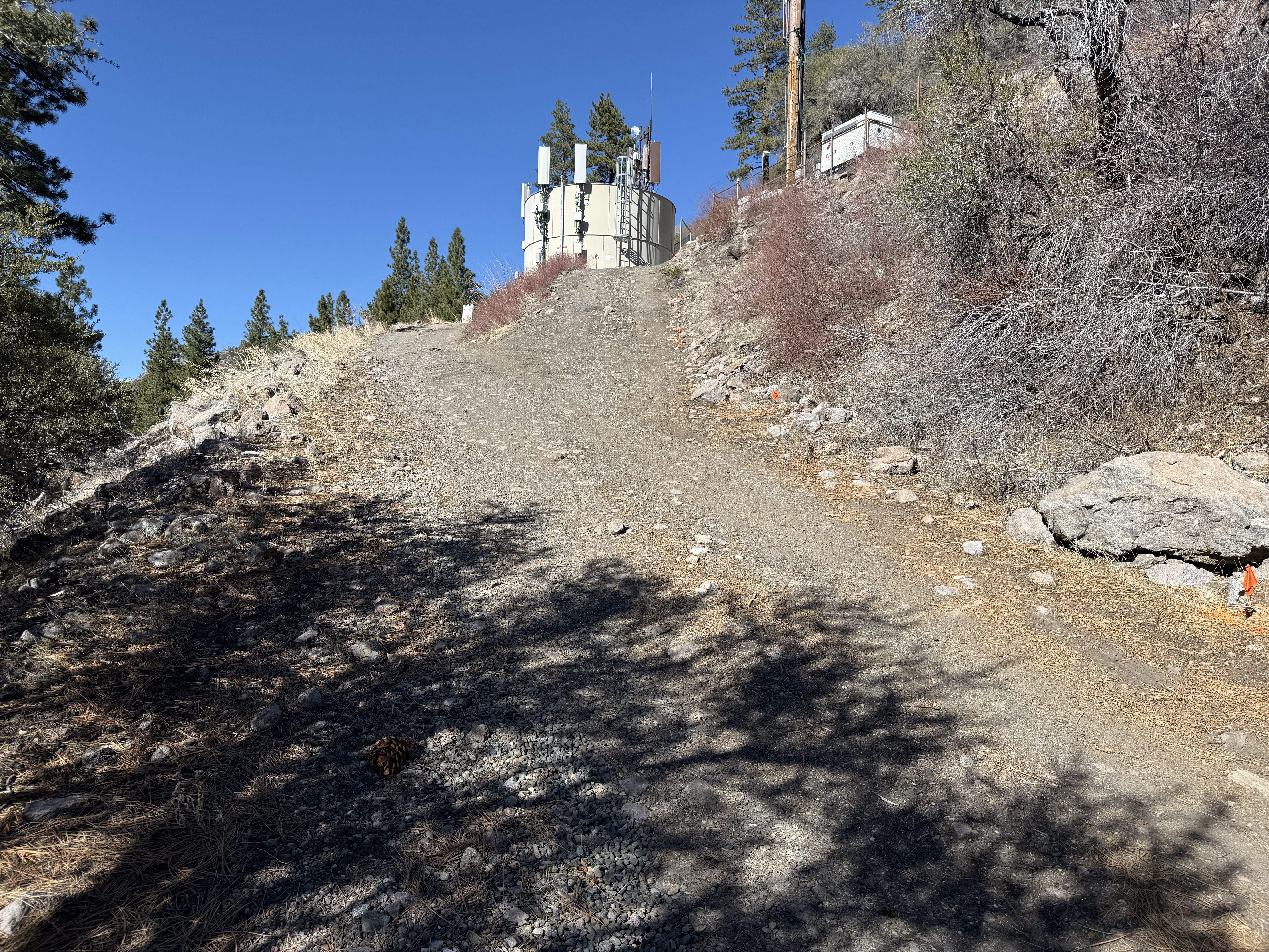The image shows a dirt and gravel road leading up to a hill where a structure with antennas is located at the top. The road appears to be unfinished and is surrounded by rocky and uneven ground. Sparse vegetation and trees are visible along the sides of the road.