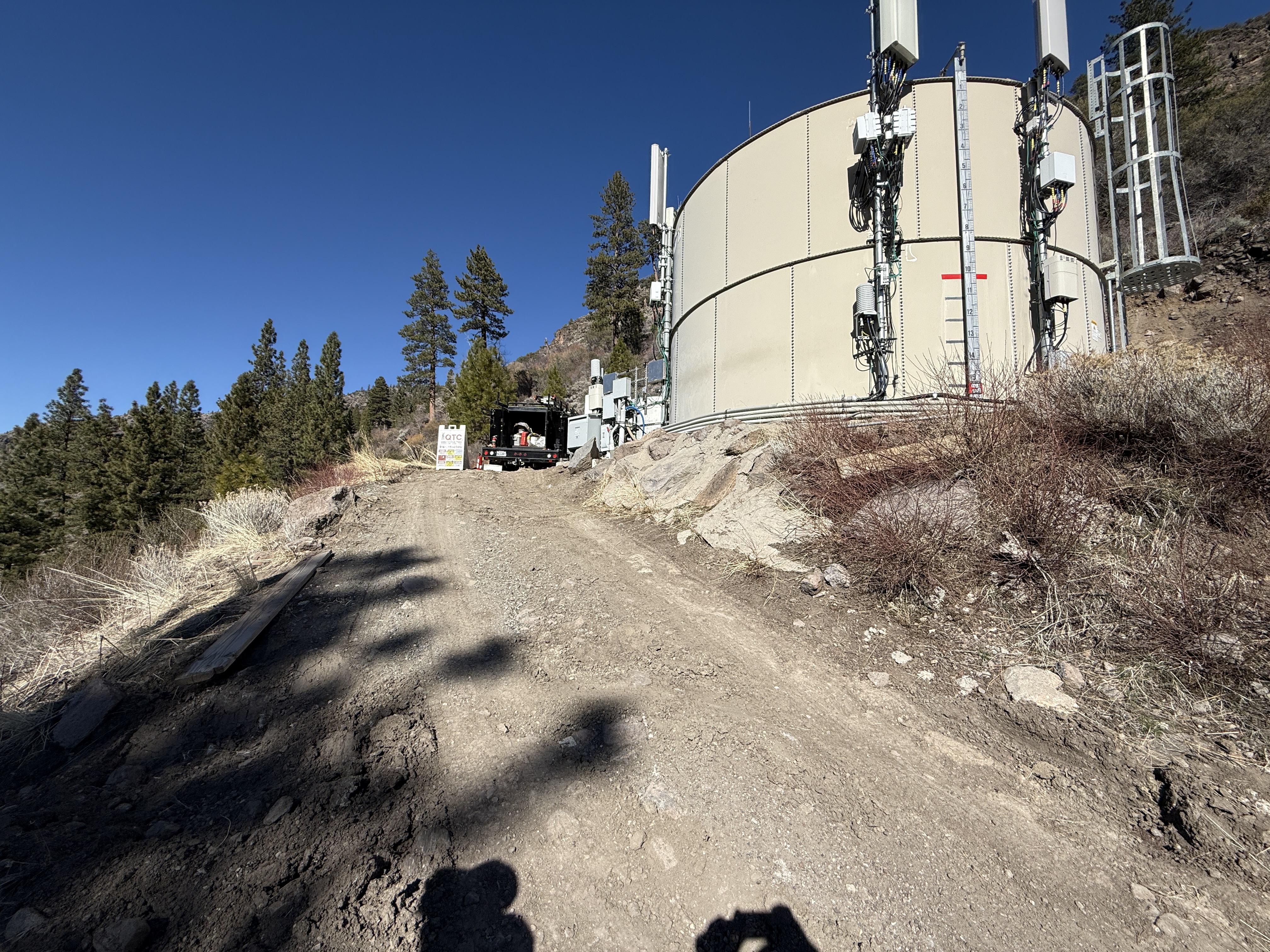 The image shows a dirt road leading up to a large cylindrical structure, likely a tank, adorned with telecommunications equipment. Antennas and cellular devices are attached to the structure. A construction vehicle is parked next to the structure. The area is surrounded by natural vegetation, and the sky is clear.
