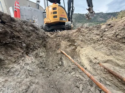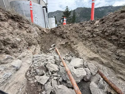 rocky and uneven ground clear weather with bright sunlight open dirt area with adequate space for equipment staging