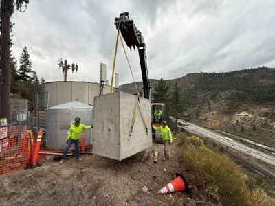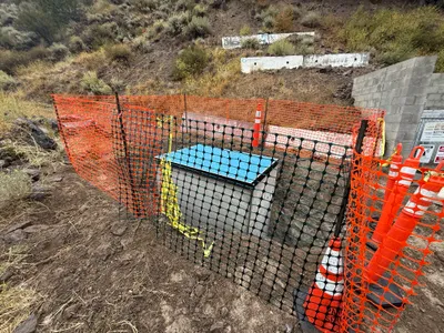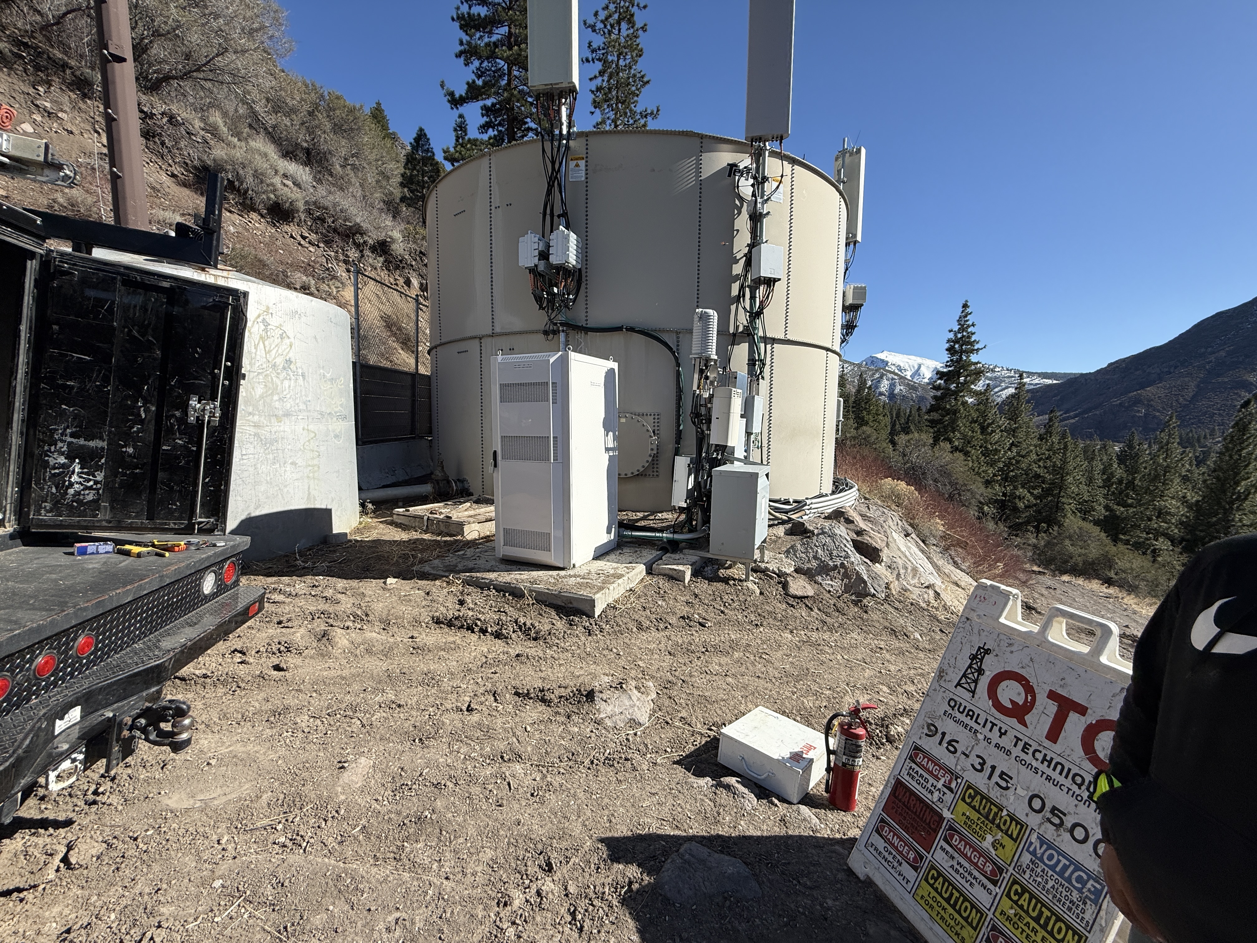 The image shows a cylindrical tank at the raw water tank access road with several pieces of electrical equipment mounted nearby. A service truck is positioned to the left, and a safety sign with various warnings is visible in the foreground. The surroundings include a dirt area with some vegetation and possibly undisturbed terrain.