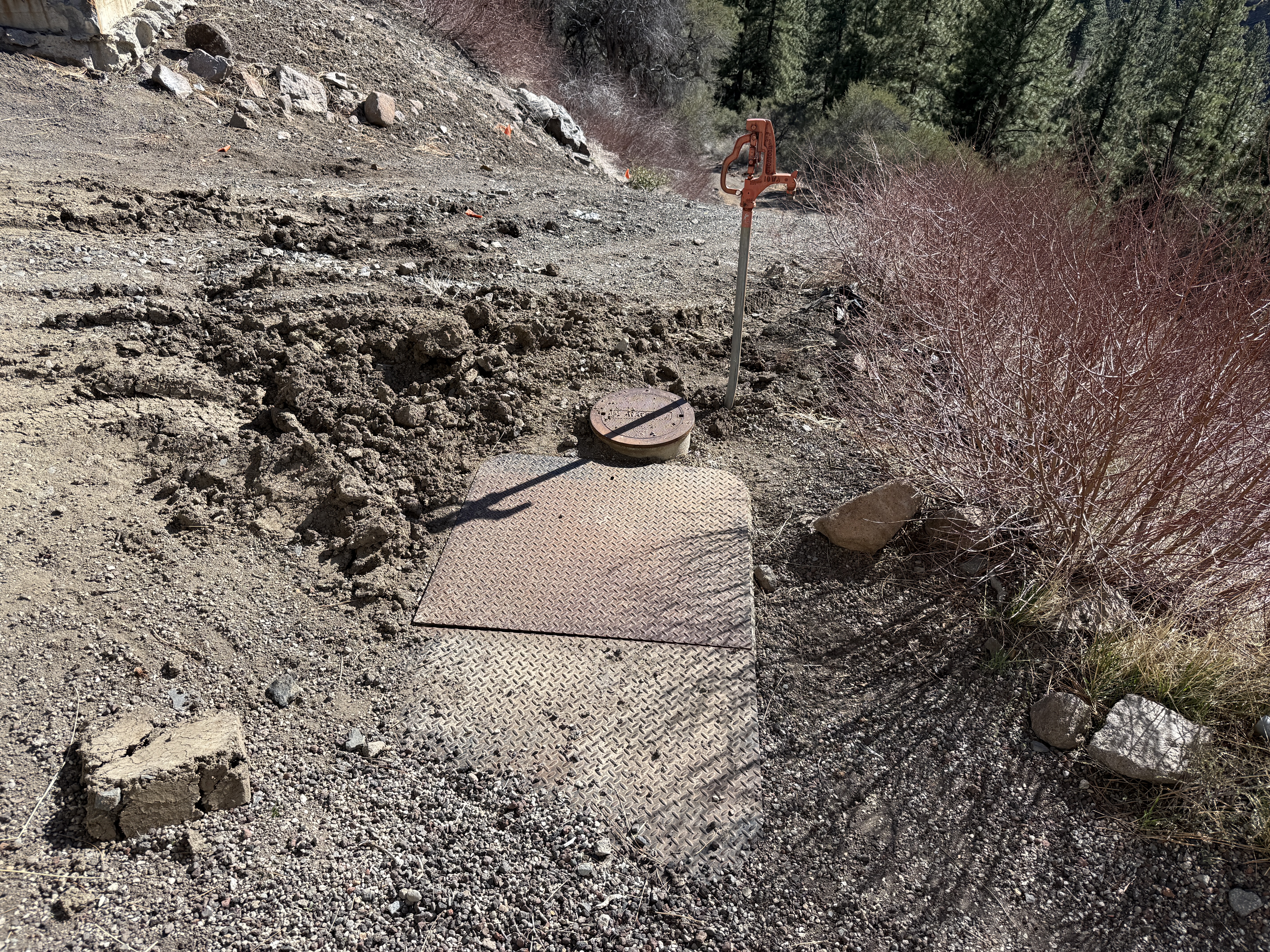 The image captures a dirt road leading to a raw water tank access point. A large steel cover plate is embedded in the ground with a round access hatch on it, positioned near the center. To the right of the cover, an orange, hand-operated water pump is visible. The surroundings are composed of bare ground and low, dry brush with trees in the background.