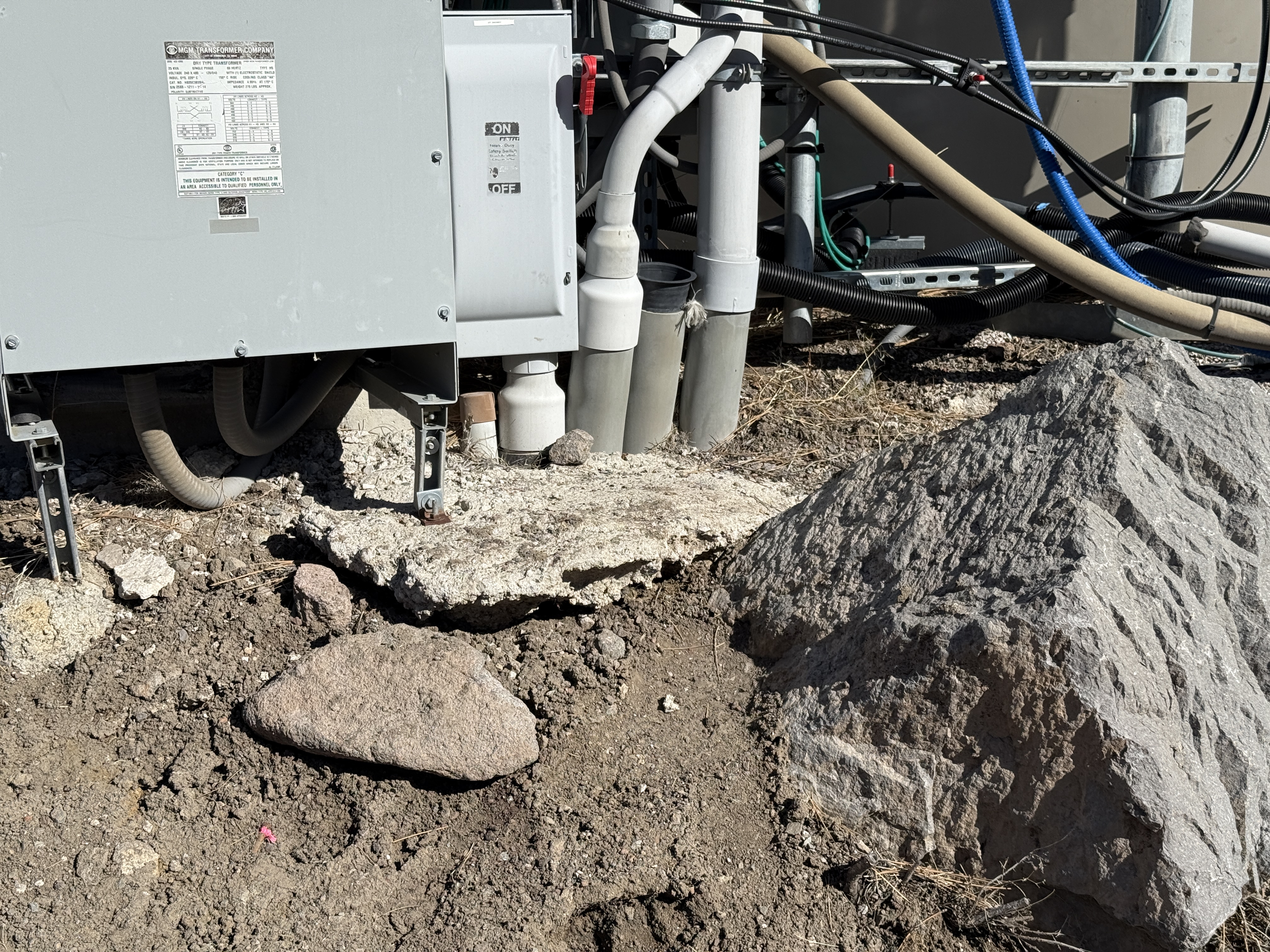 The image displays a gray electrical panel supported on metal legs with multiple conduits emerging and connecting below it. The ground beneath is uneven with visible soil and rocks. Various cables and conduits are routed around and underneath the panel, indicating pre-installation work or site preparation.