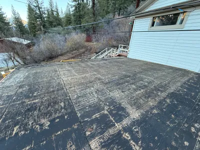 worn black roofing material daytime lighting with clear visibility clear and open roof area with trees surrounding