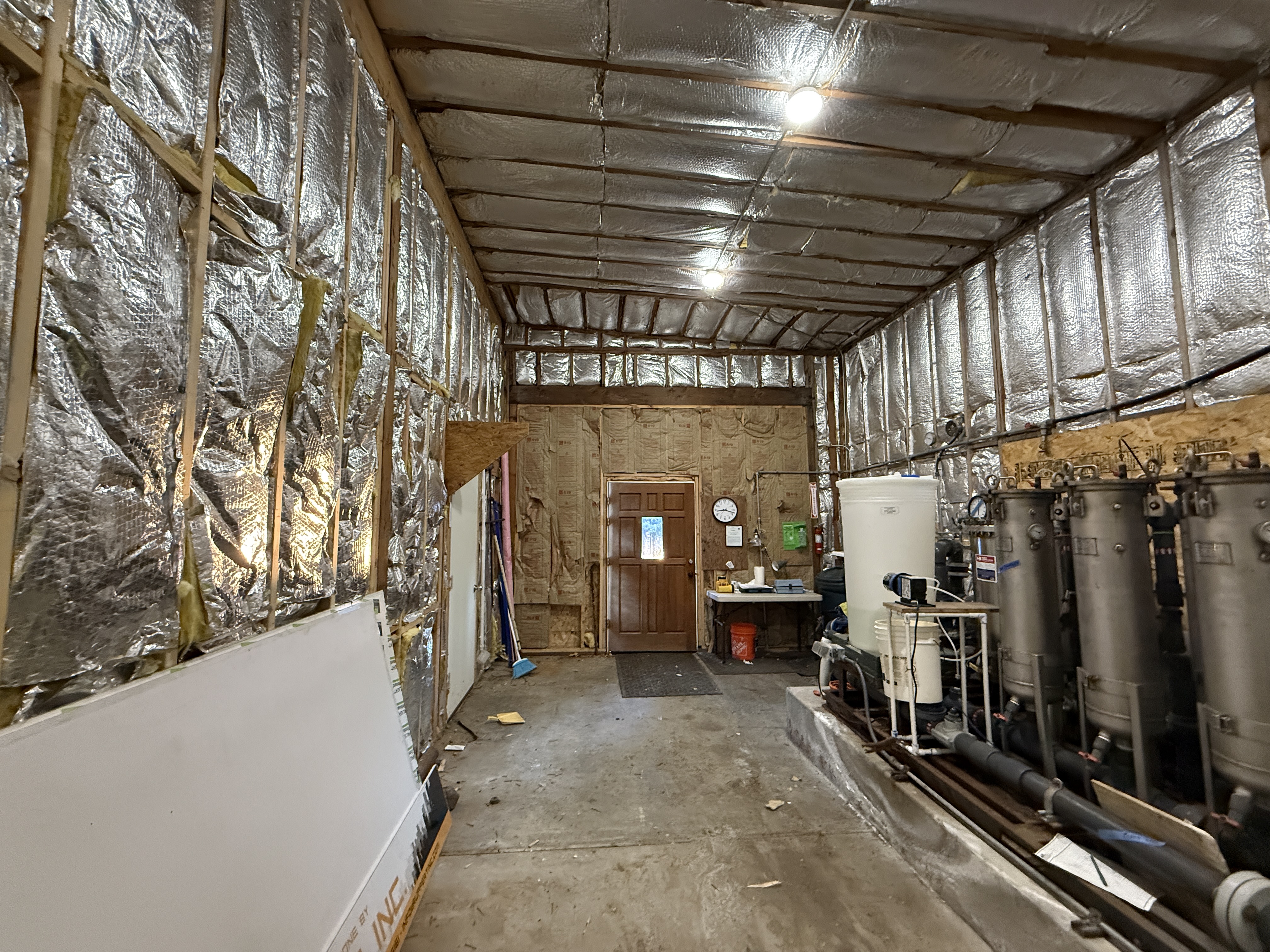 The image shows an interior room of a water treatment plant with insulation on the walls and ceiling. There are multiple large cylindrical filters or tanks on the right side, alongside a white drum or tank. A wooden door and a wall clock are visible at the far end of the room. The floor is concrete, and lighting is provided by ceiling fixtures.