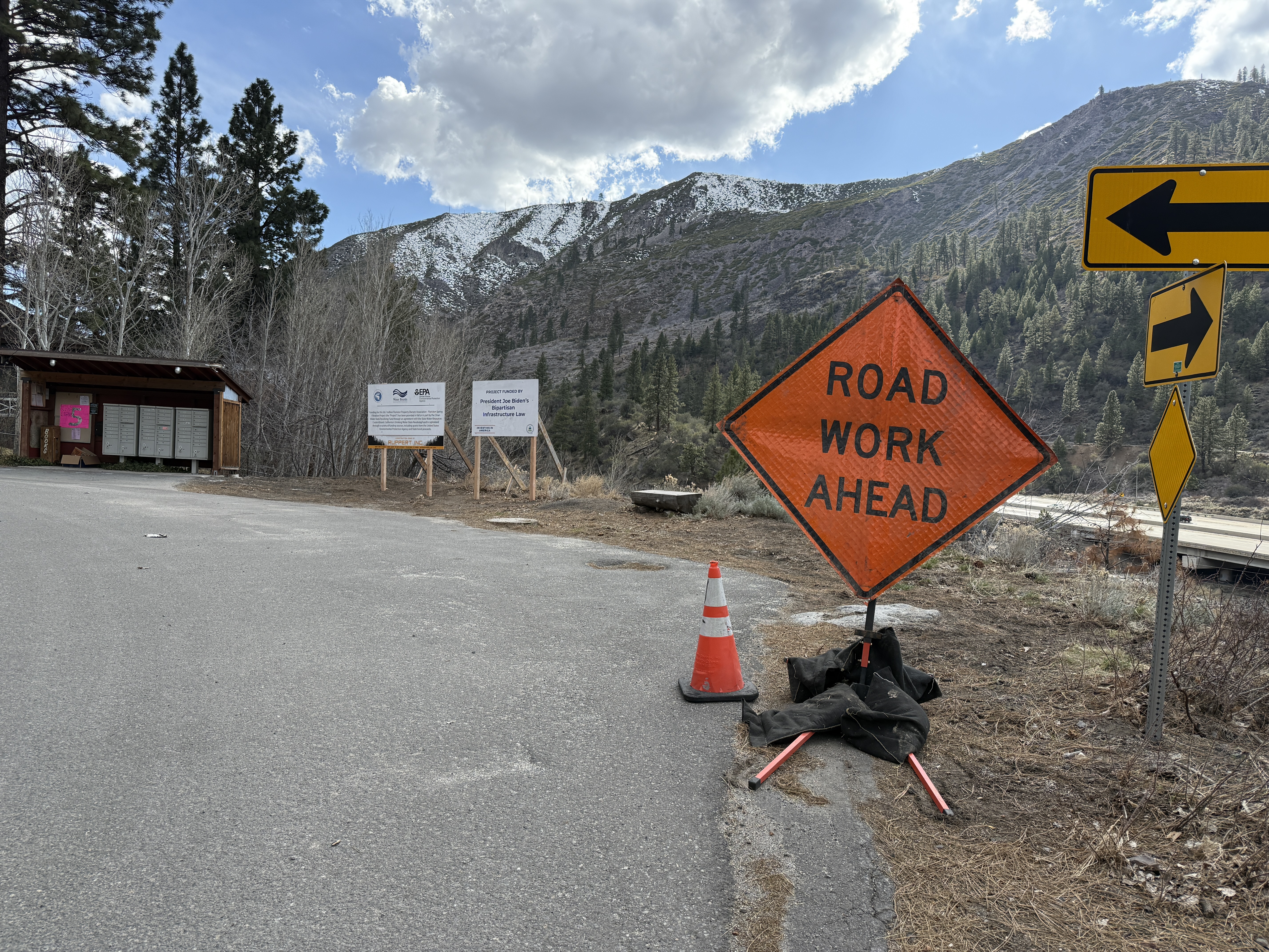 The image shows a 'ROAD WORK AHEAD' sign positioned on the right side of a paved road with a traffic cone placed in front. To the side, there is a wooden bulletin board structure, and additional signage providing project information is visible. The area is surrounded by trees and mountainous terrain with some snow evident on the distant hills.