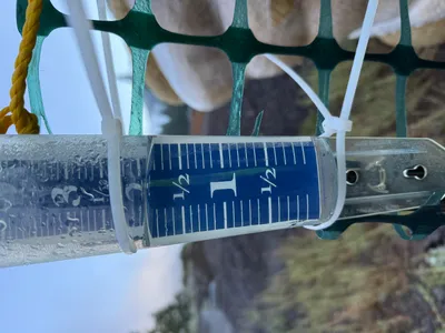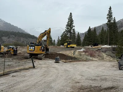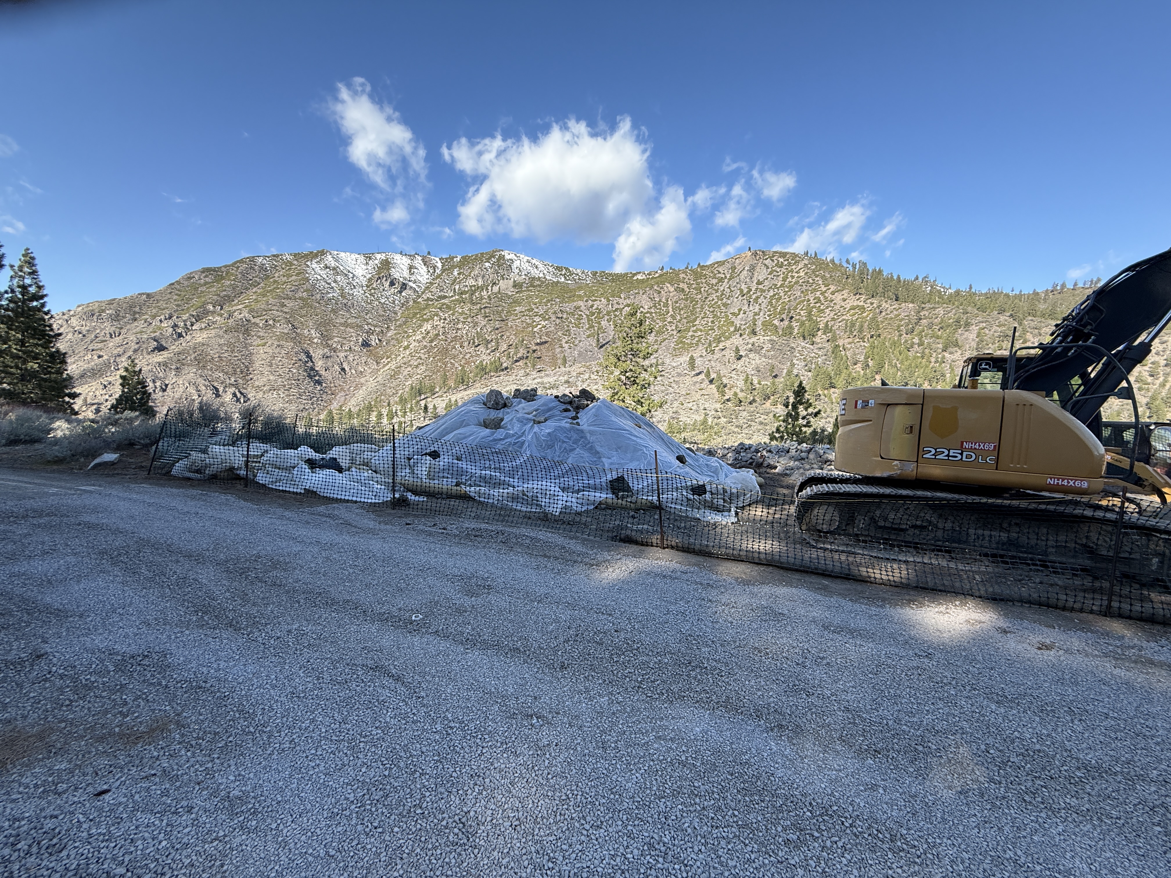 The image shows a pile of erosion control materials covered with fabric near a mountain. A tracked excavator is positioned to the right of the materials. Snow is visible on the mountain in the background. A safety fence is set up around the materials.