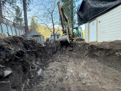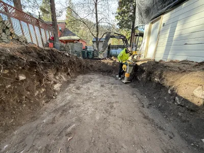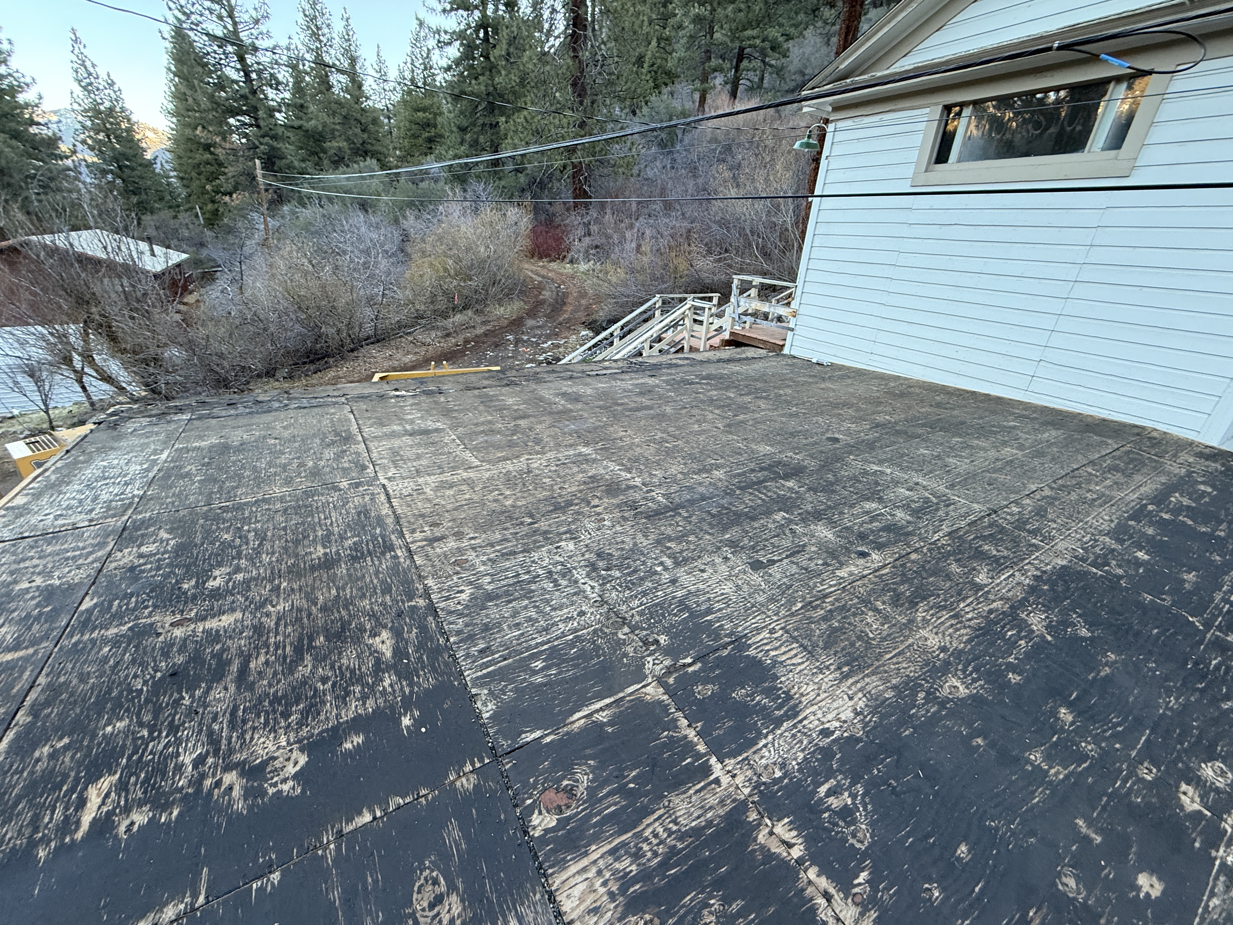 The image depicts a flat roof near a building with visible plywood panels laid down. The wood shows signs of wear and possible exposure to the elements. There are no visible personnel or active work taking place. The surrounding area includes trees and some brush, with telephone lines overhead.
