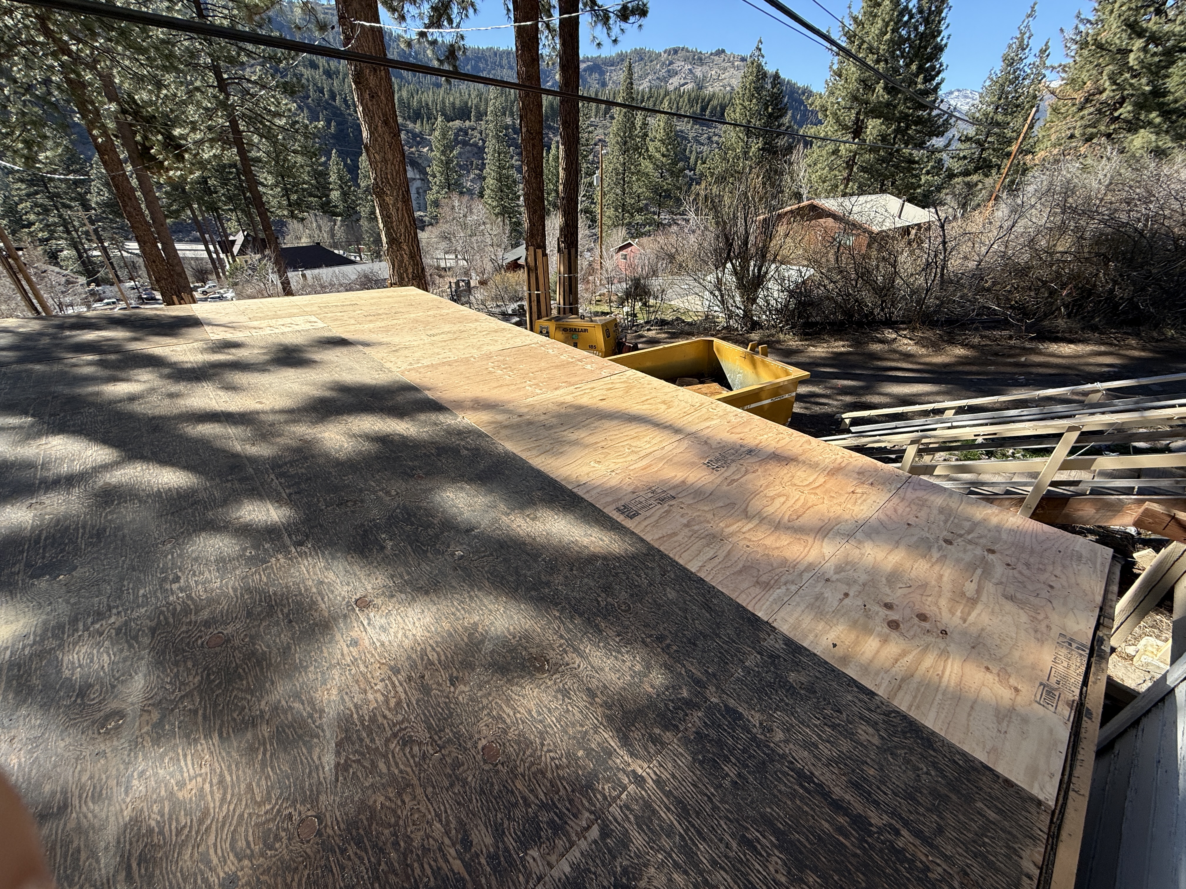 The image shows a section of a roof with partially installed plywood sheets. A contrast in color suggests some sections may be new or replaced. There are several wooden planks stacked nearby. Trees and residential structures are visible in the background.