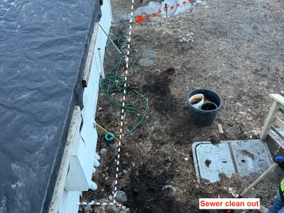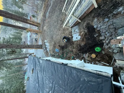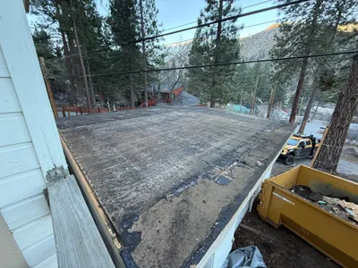 The image shows a section of a roof covered with a black tarp secured by wooden planks. Adjacent to this structure is a large yellow storage container. The roof is part of an outbuilding next to a larger structure, likely the schoolhouse. The setting appears to be in a wooded, mountainous area with power lines visible.