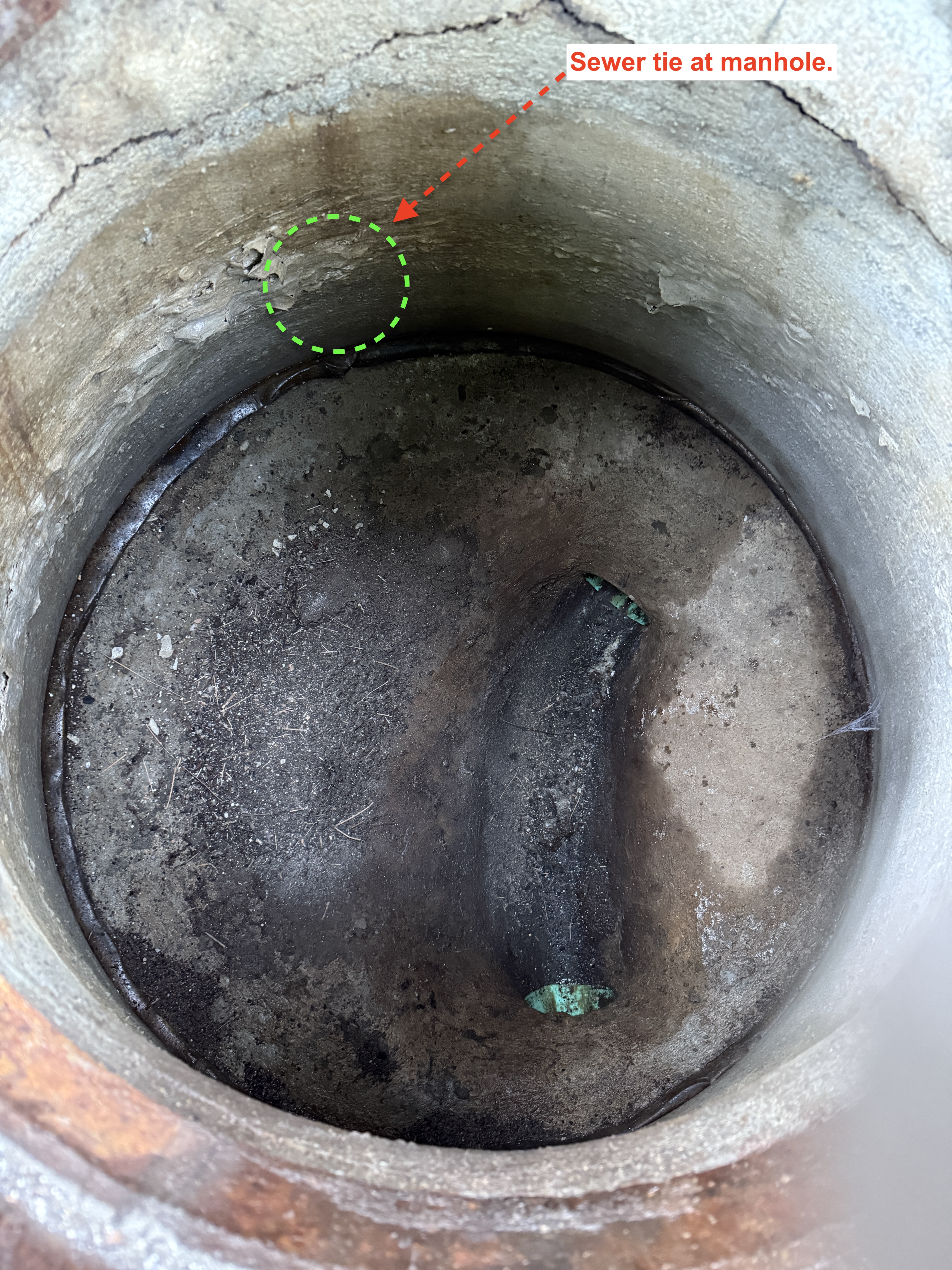 The image displays the interior of a manhole with a visible sewer pipe tie connection. The pipe is situated near the bottom of the manhole, with concrete surrounding it. There is minimal visible debris on the bottom surface. The walls of the manhole are circular and made of concrete.