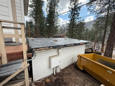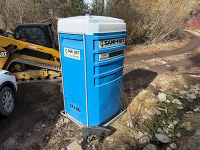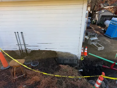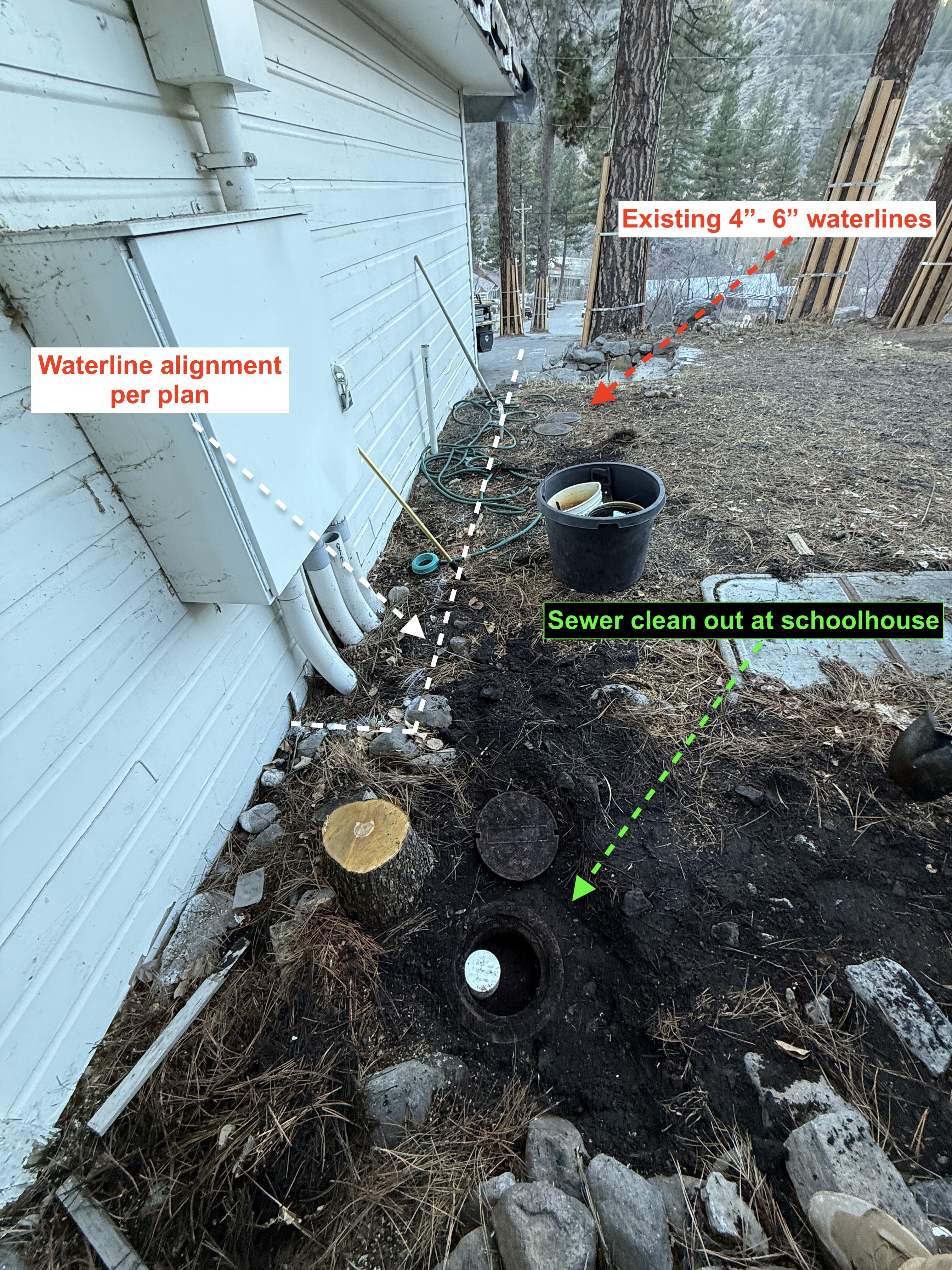 The image captures a section of a site with existing waterlines and a sewer cleanout marked outside a schoolhouse. The existing waterlines are indicated with dashed red lines running along the side of the building. A sewer cleanout is visible in the ground with its cover removed. The surrounding area has dirt and rocks, with a bucket containing hoses nearby. The markings on the image suggest a plan for waterline alignment.