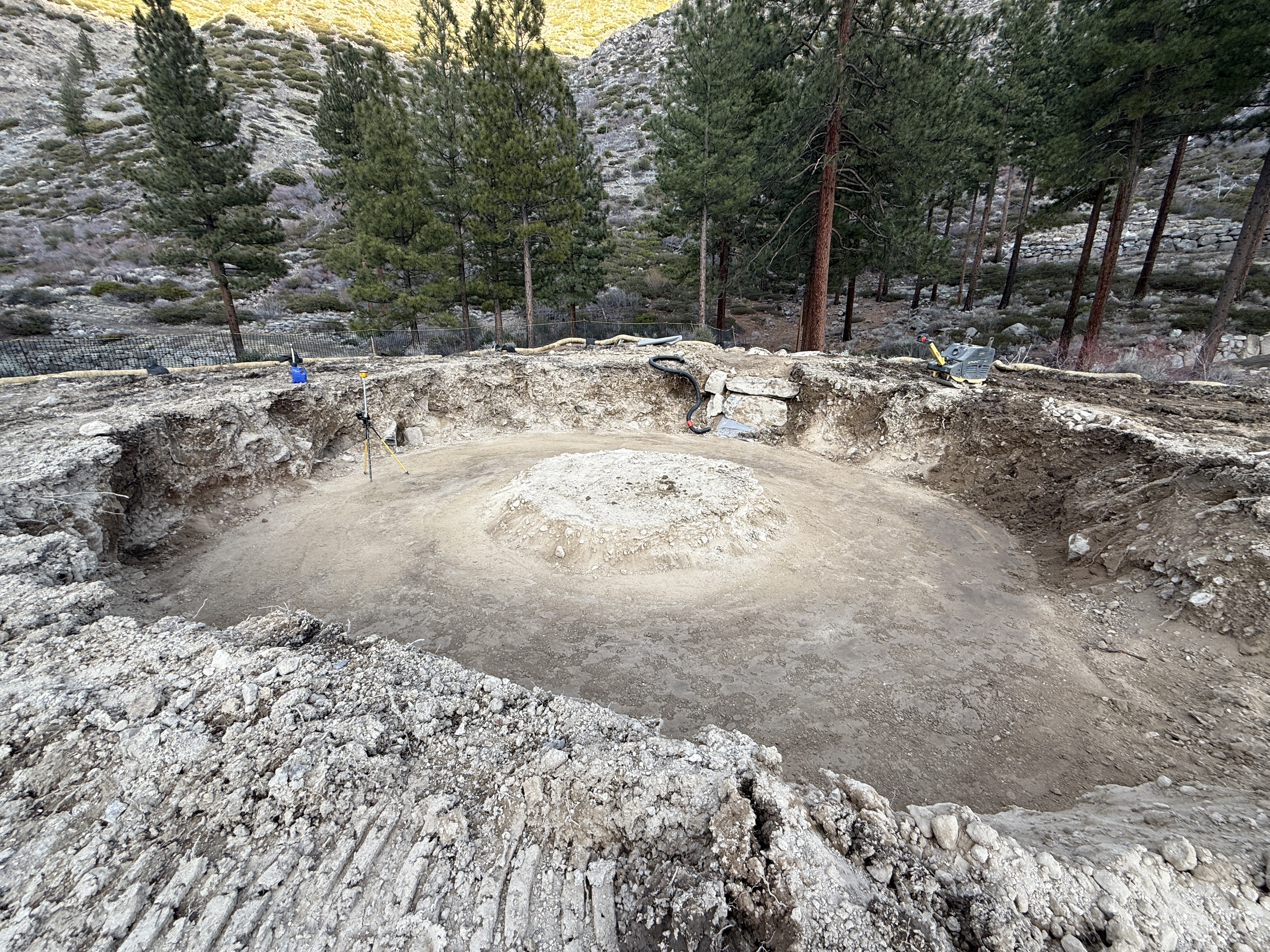 The image shows a circular excavation area with a central raised dirt section, likely for a tank foundation. The surrounding area is clear with visible construction tools including surveying equipment. The site is located in a wooded area with trees in the background.