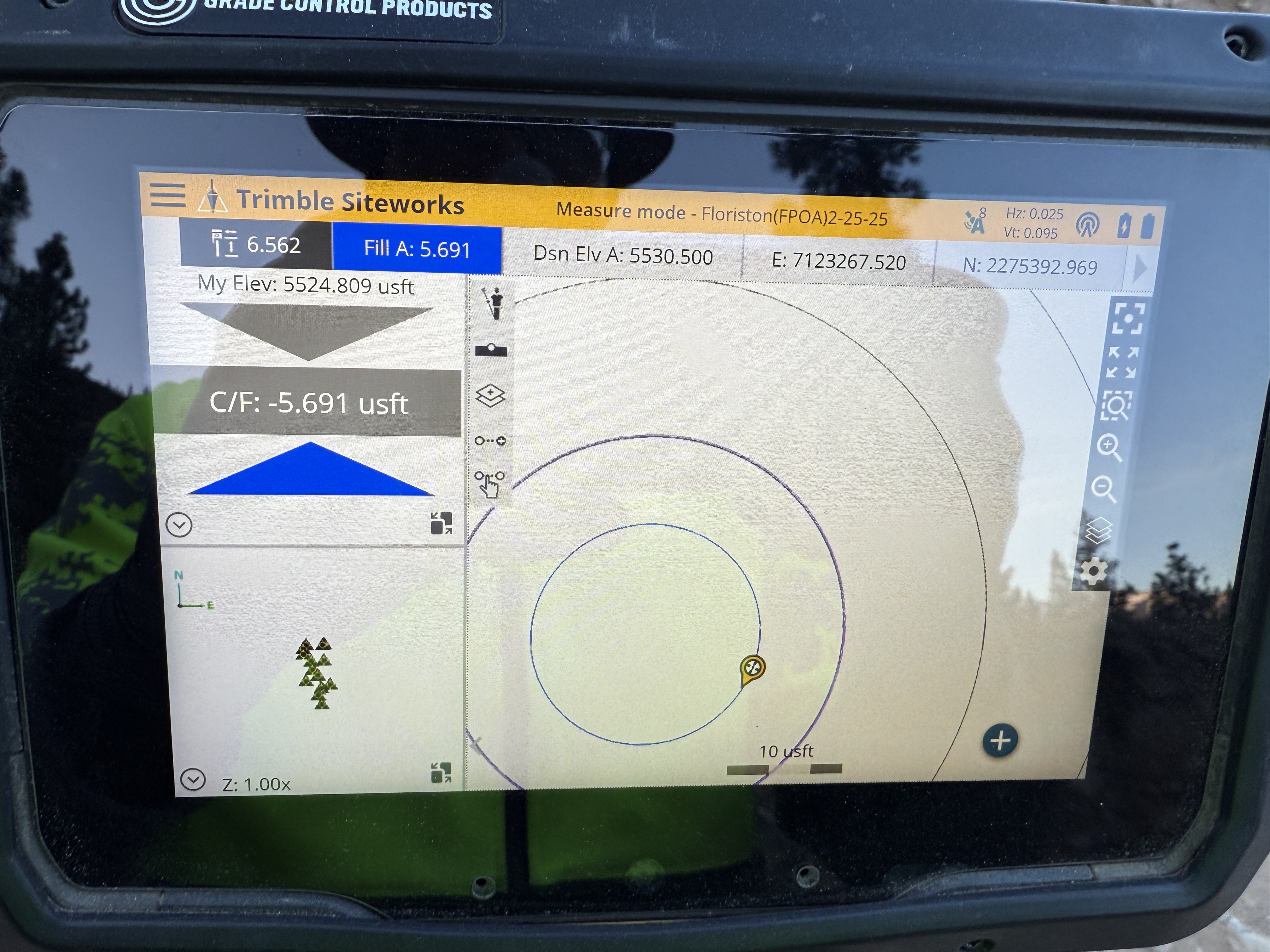 The image shows a digital interface from Trimble Siteworks software, likely used for construction surveying. The screen displays elevation information with values such as 'My Elev: 5524.809 usft' and 'Dsn Elev: 5530.500 usft'. It indicates a fill cut/fill value of -5.691 usft, suggesting current versus desired elevations. The interface is likely used to guide earthwork or grading operations.