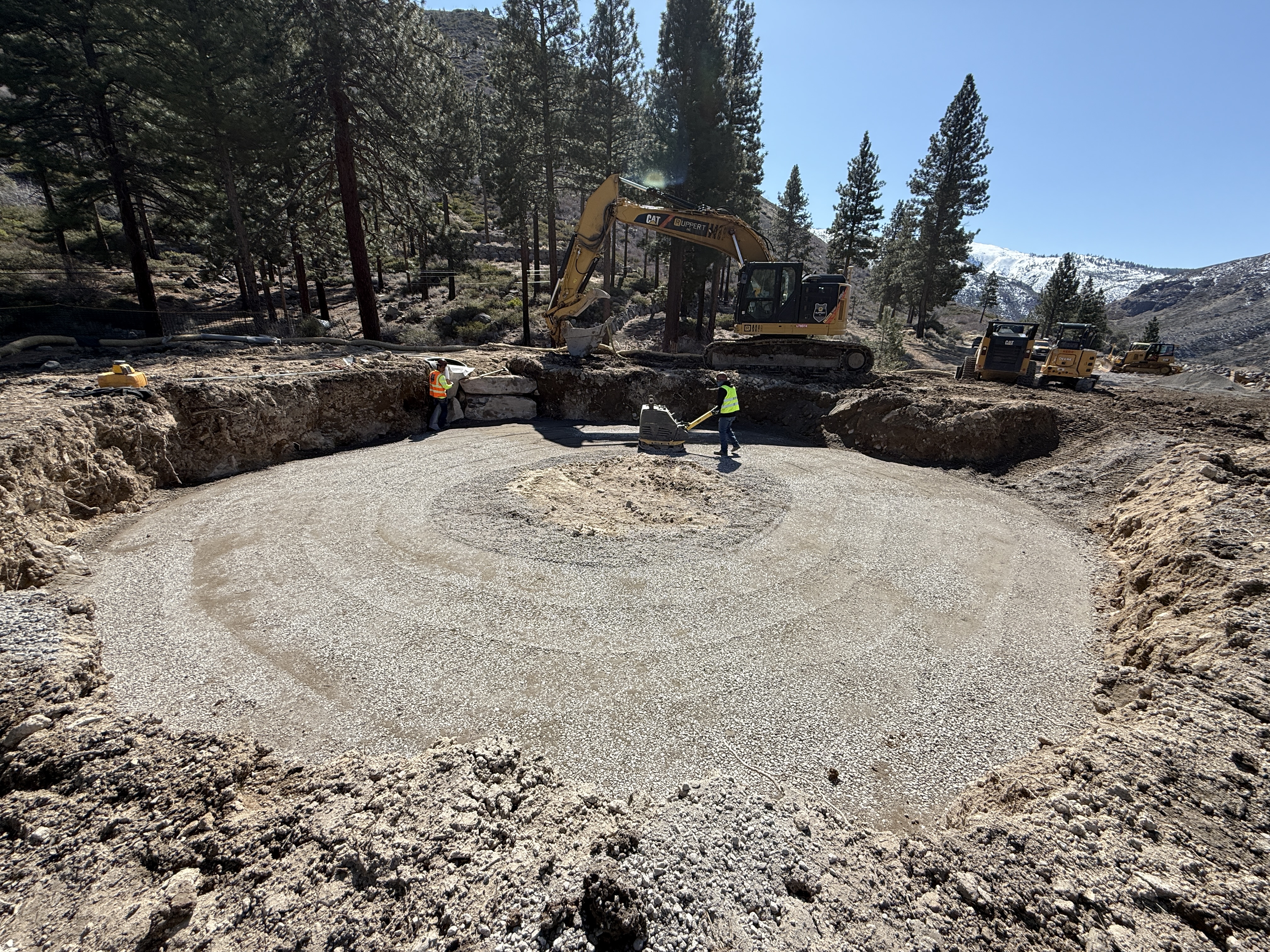 The image shows a large circular excavation area prepared for a tank foundation. An excavator and a compactor are in operation, with workers visible near the edge. The ground is covered in compacted gravel, and the setting is a mountainous area with trees in the background.