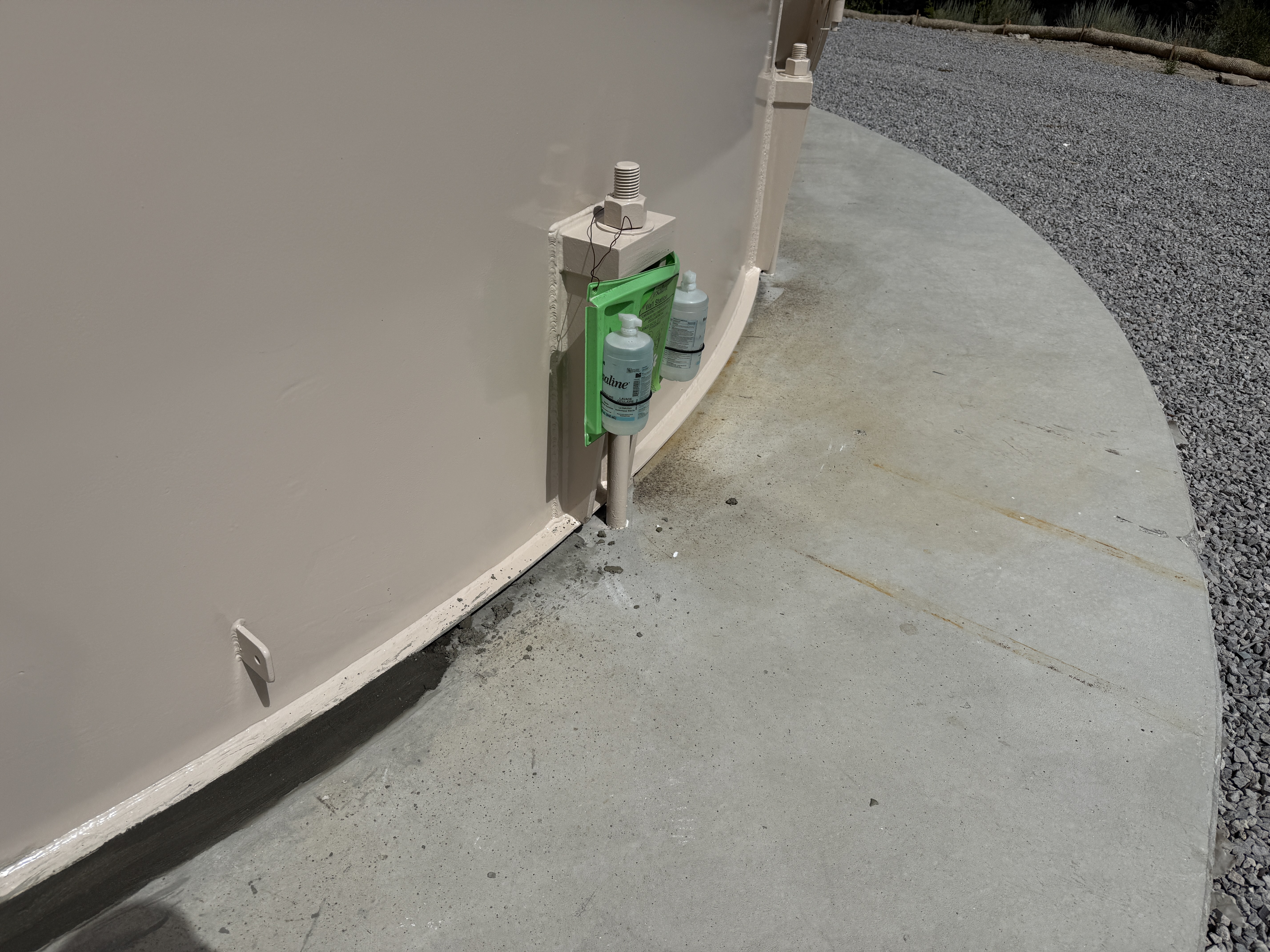 The image captures the base perimeter of a large tank, showing concrete flooring. A drainage pipe system is connected to the tank, with small collection bottles attached or placed nearby. The drainage area appears to have minor stains on the concrete, possibly due to liquid accumulation or spillage. The surrounding area includes gravel, indicating it may be part of a tank foundation or pad.