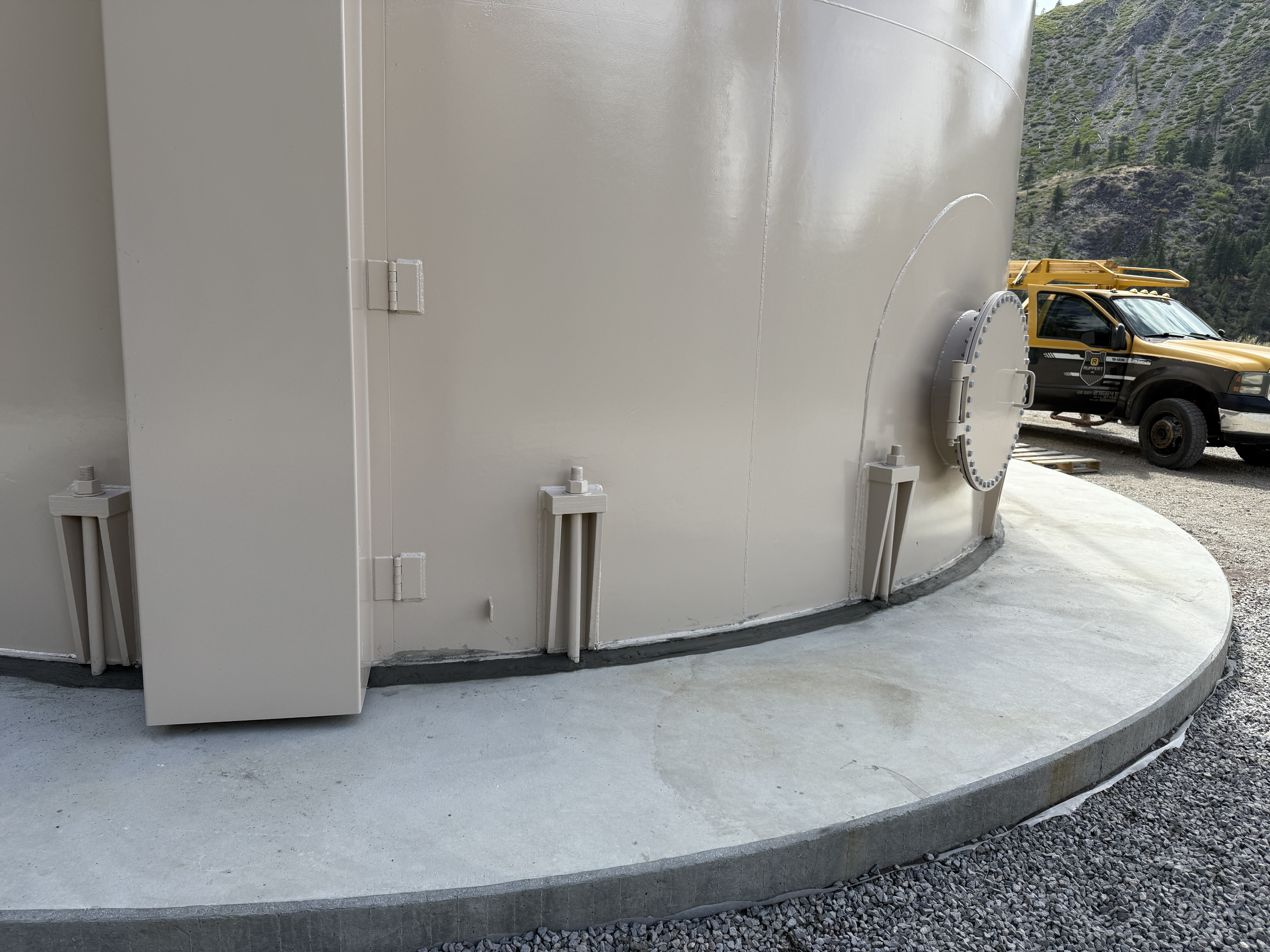 The image shows the lower section of a large cylindrical tank, which is installed on a concrete foundation. The tank is secured with visible steel supports. A hatch or access door is mounted on the tank's side. In the background, a utility truck is parked on gravel near the tank.