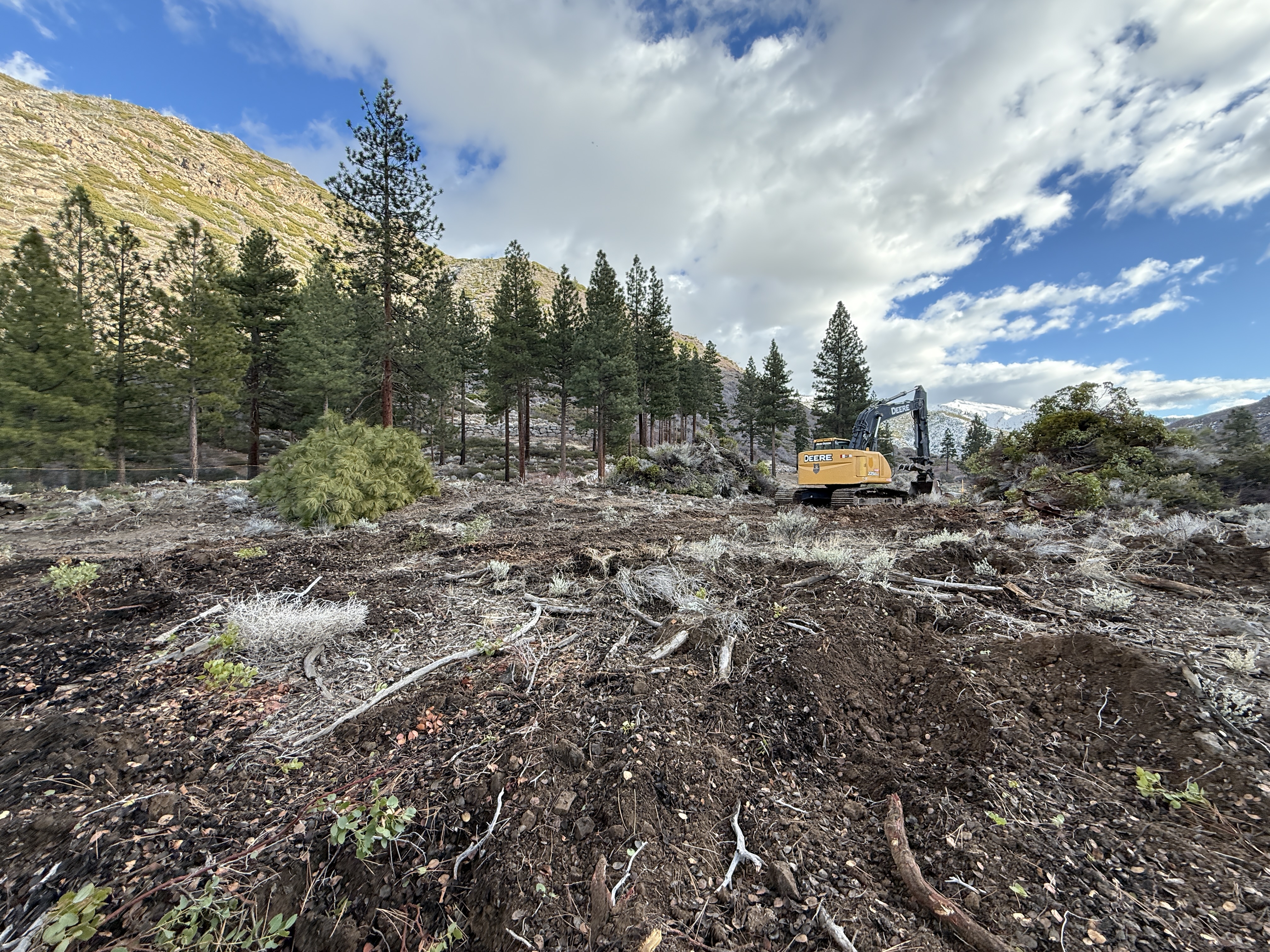 The image shows an excavator positioned in a cleared area within a forest, with visible soil, tree stumps, and mixed vegetation in the foreground. The excavator is likely engaged in excavation or site grading activities, preparing the land in the wooded environment. There's no visible indication of ongoing construction of structures or utilities.