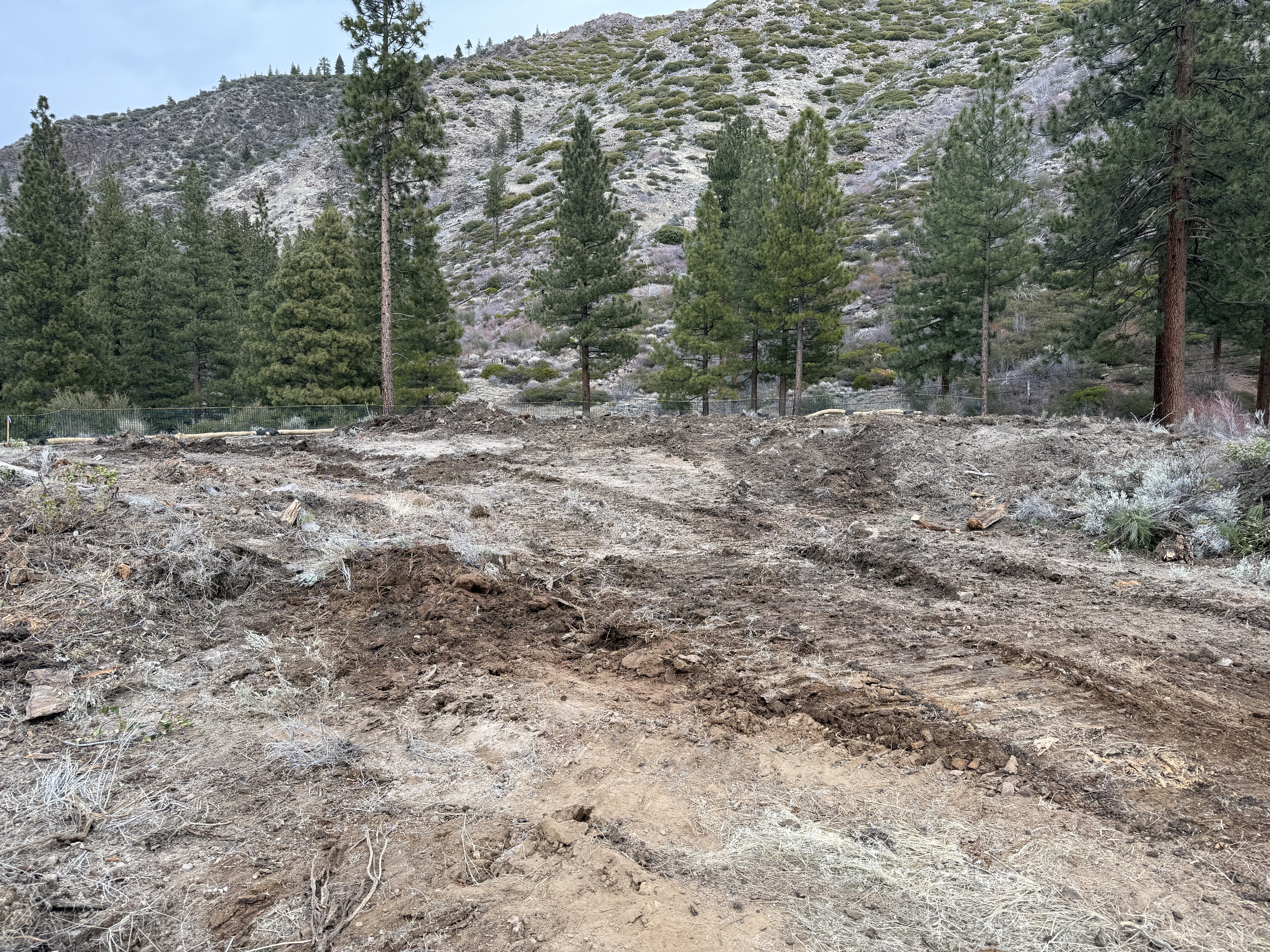 The image shows a cleared area with disturbed soil and light grading activities. Pine trees and mountainous terrain border the site, indicating a natural setting. No heavy machinery or construction materials are actively visible. The ground appears uneven with signs of recent activity.